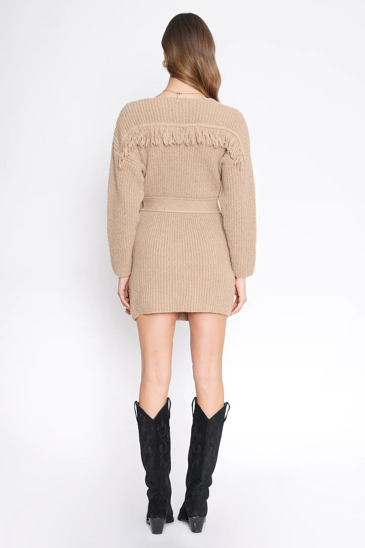 Fully embrace sweater weather in this fringe-adorned wrap dress finished with an ultraflattering belted waist.