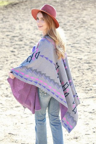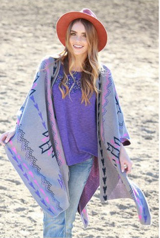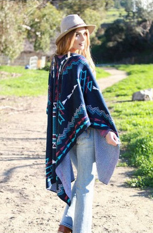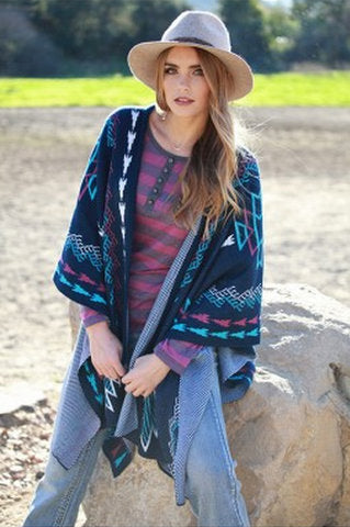 With a bold southwestern-inspired pattern, this knee-grazing open-front poncho is just right for those wandering road trips and bonfires at the beach. As an everyday Fall piece, throw cozy knit piece over a buttoned shirt and fitted trousers for boho city chic.