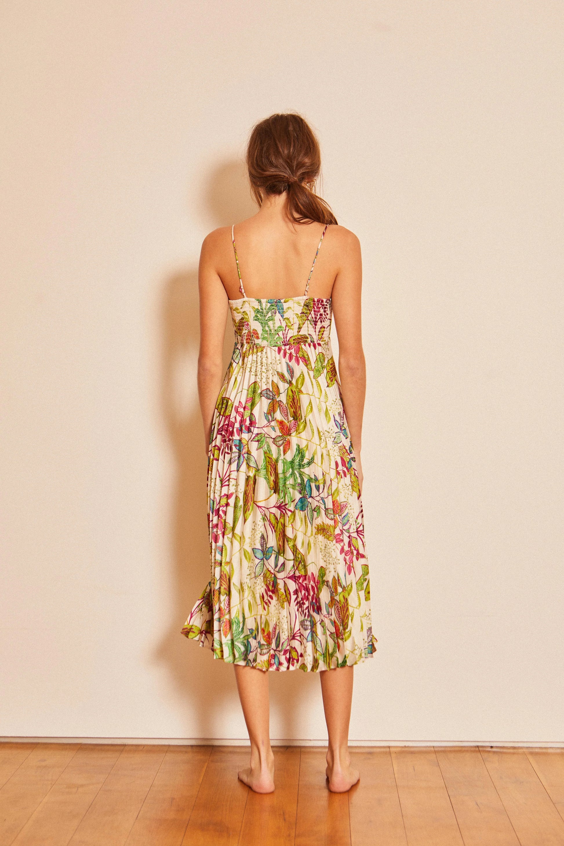 Turn heads in the Donna Dress! This vibrant midi dress features a strappy, ruched bodice with adjustable straps and smocking for the perfect fit. Move around with ease in the swing. pleated skirt; you'll be the star of the show