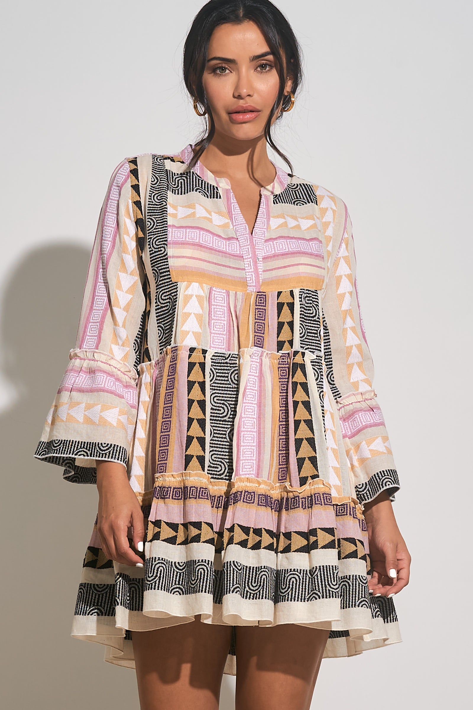- The Arabella Mini Dress is a vibrant addition to your summer wardrobe, featuring a dynamic geometric striped print in neon multi hues. The tiered design adds a flirty touch to this flowy mini dress, while side pockets enhance its charm. Perfect for resort vacations or casual summer days, the Arabella Mini Dress effortlessly combines style and comfort for a stylish and carefree look.