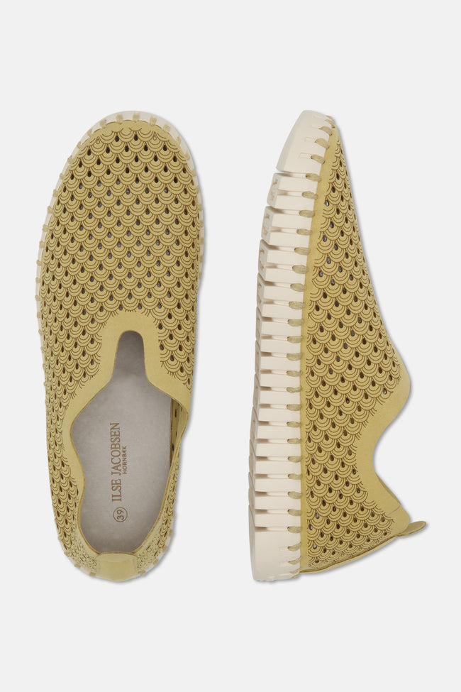 Scalloped embossing frames all-over teardrop perforations on the upper of a super-comfortable slip-on sneaker that's whipstitched to a flexible rubber sole.The shoe is practical, very comfortable and has a great appearance. With its flexible outsole made of natural rubber, and upper with laser cut pattern, which makes it breathable, makes it the perfect travel shoe. The shoe is made of recycle microfiber, and comes in all kinds of colors, from luxurious basic colors to bright happy colors, with matching stitching. The construction is made without any glue. This cool and practical shoe is an absolute must have, and will never go out of fashion.