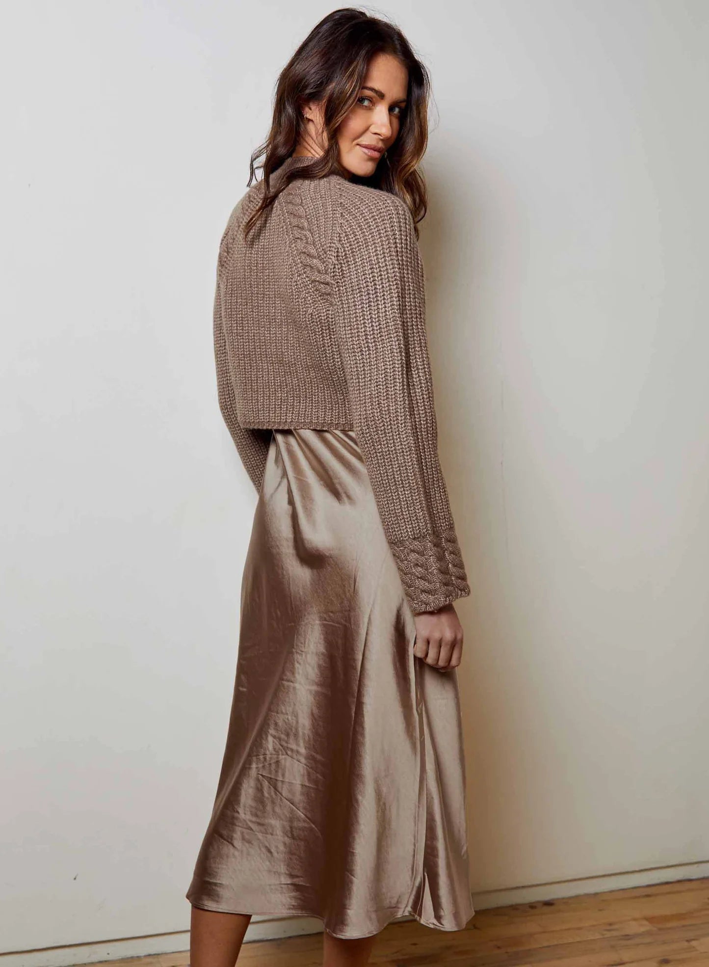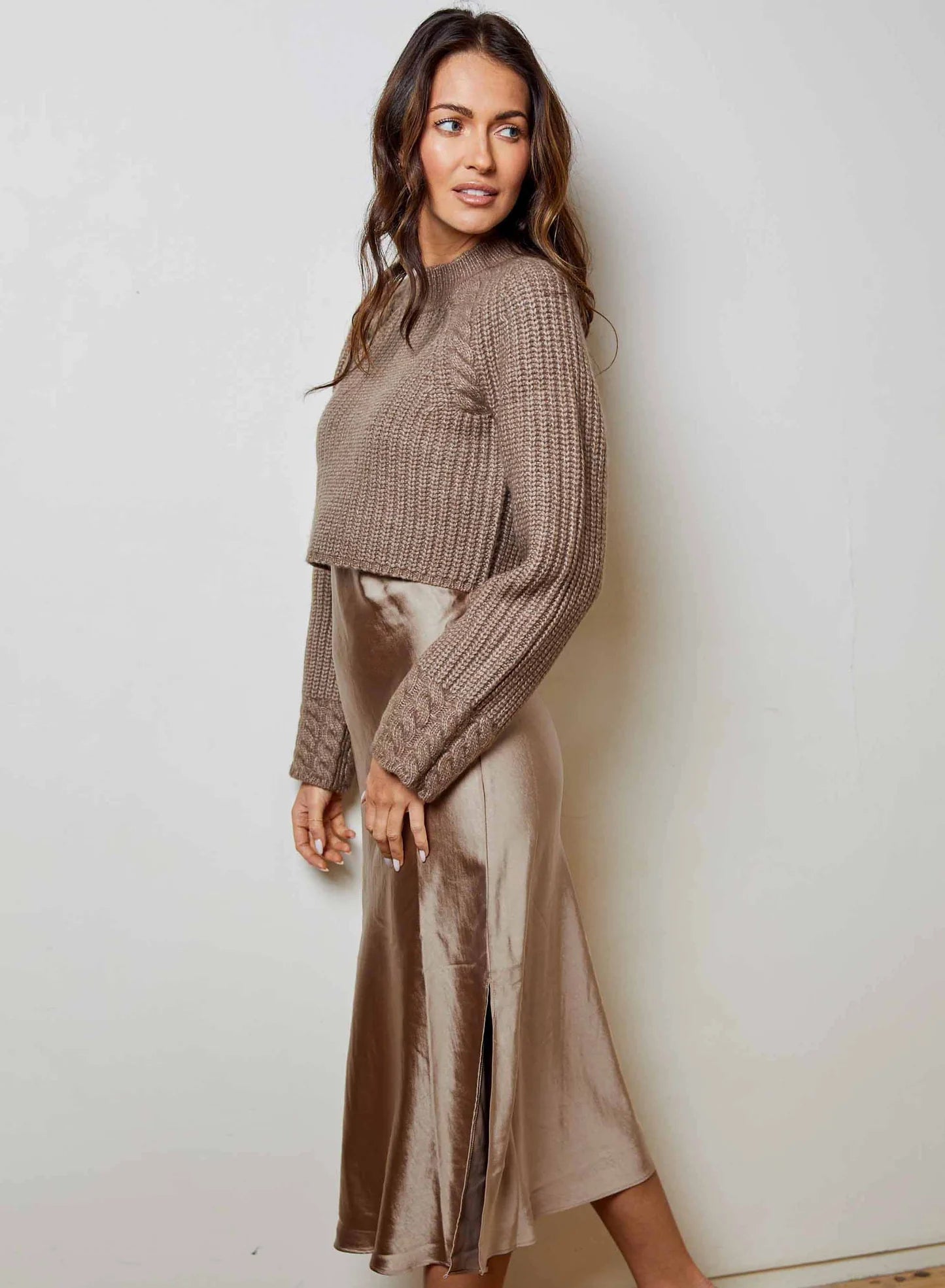 Sweater has cable detailing at armhole and cuff trim. Slip dress has adjustable straps and side seam slit opening.