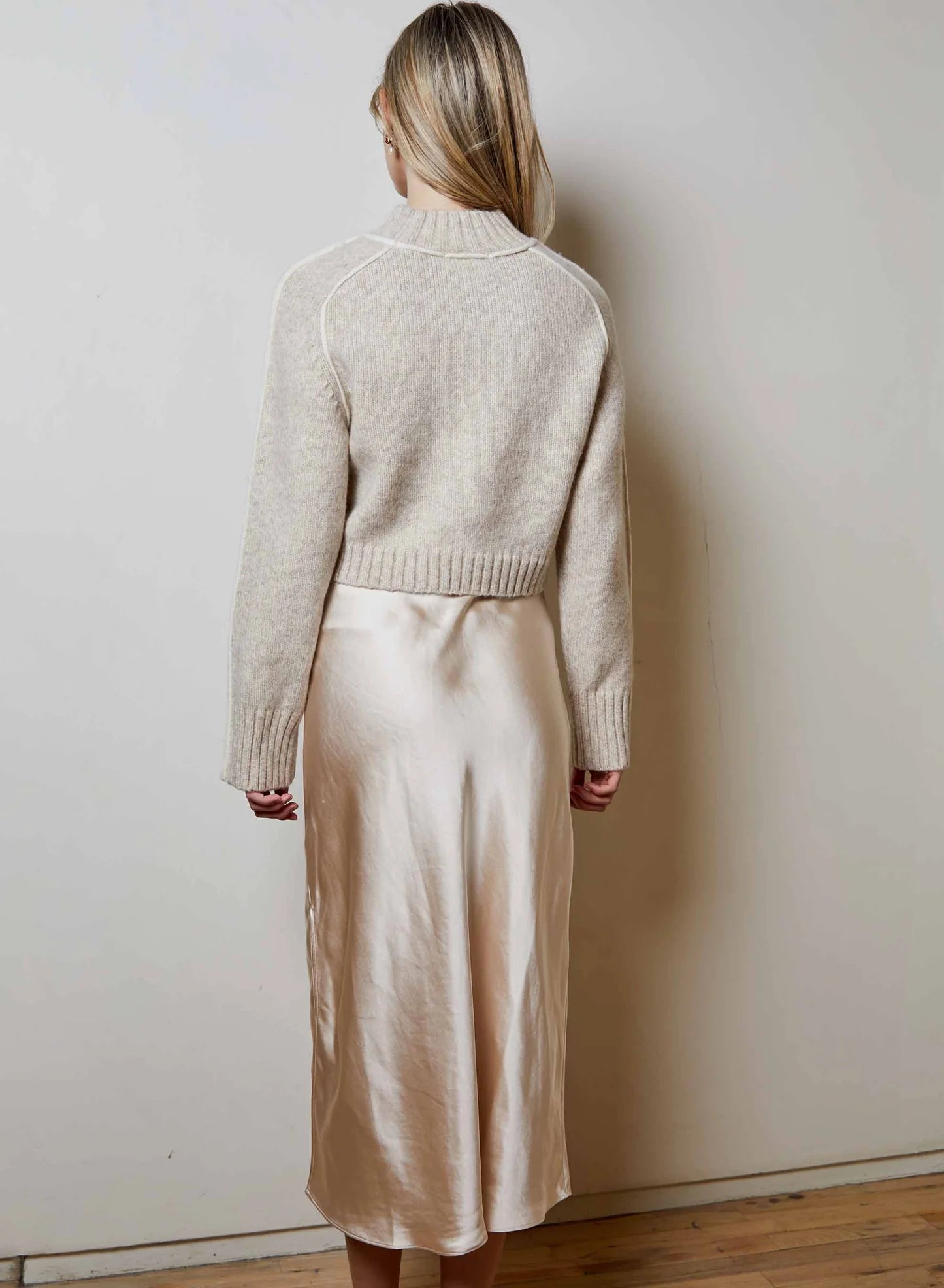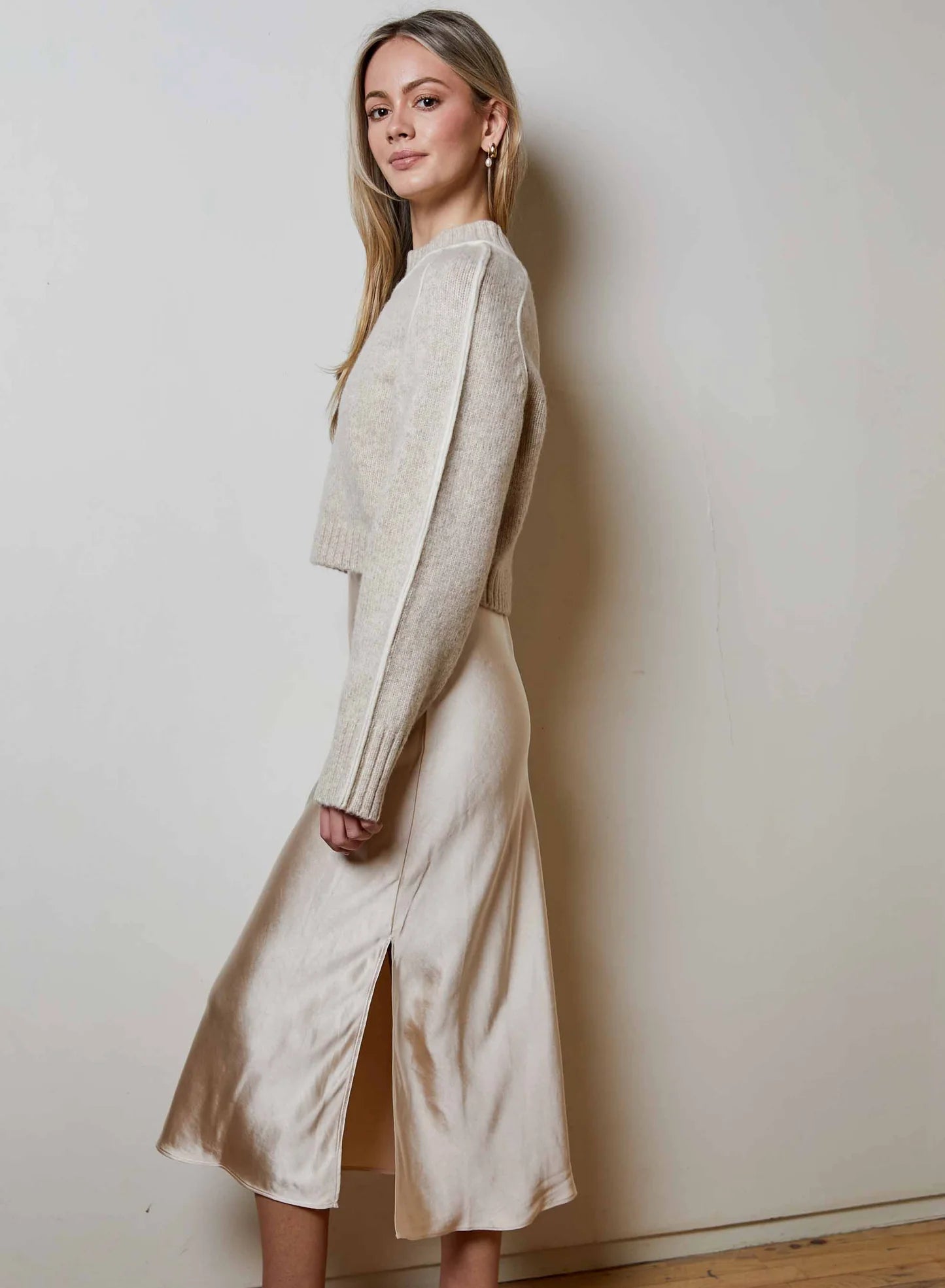 Raglan sweater with contrast piping detail. Slip dress has adjustable straps and side seam slit opening.