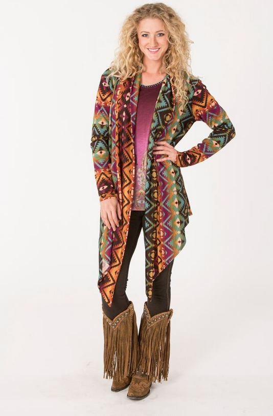 Double D Ranch Chicora cardigan has a gorgeous Aztec design full of gorgeous New Mexico hues. The starburst of colors, truly gives you the Native American / Western feel! The Chicora Blanket Cardigan is all you need over your favorite T-Shirt. The front is made to drape open, giving a cardigan a draped front.