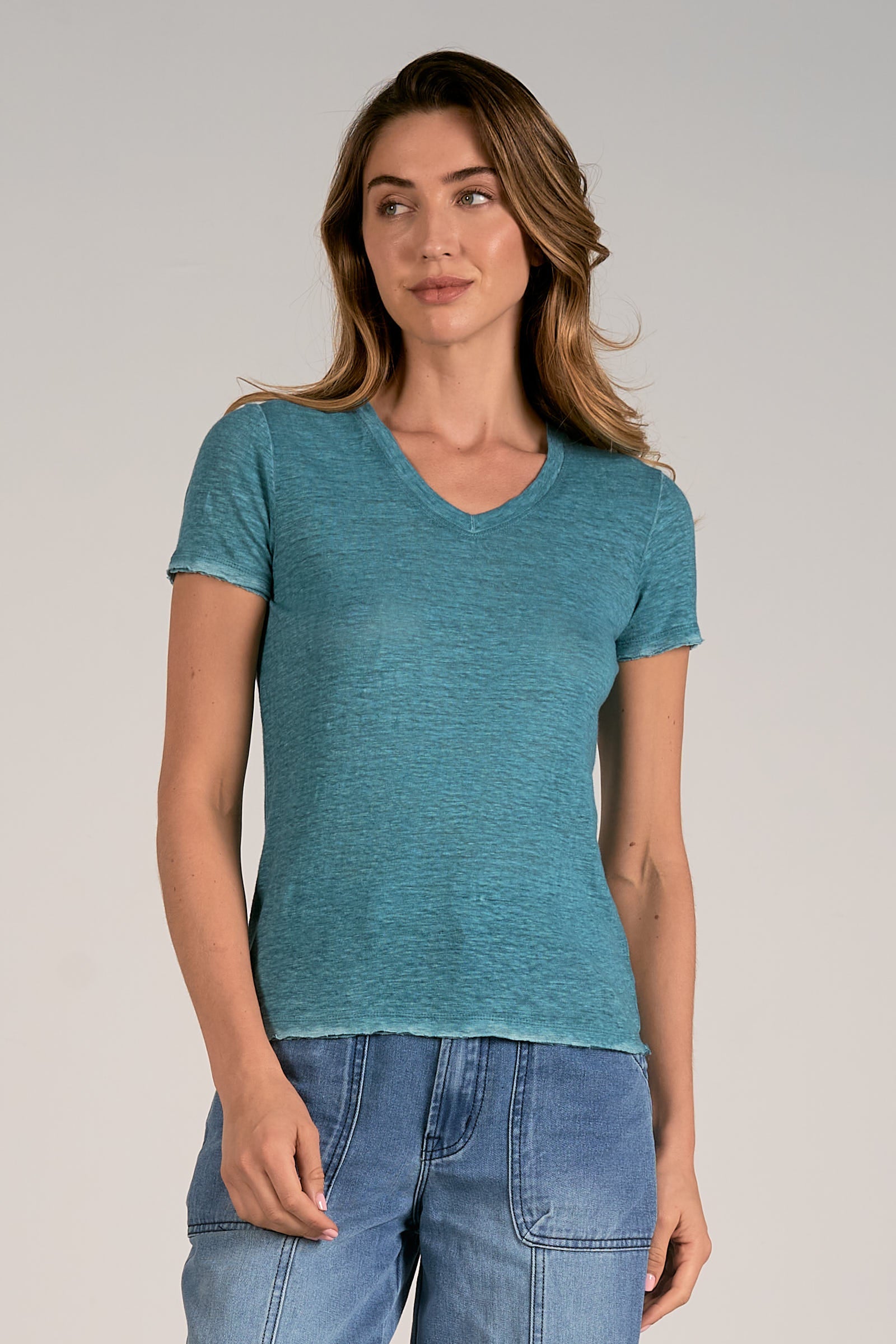 Short sleeve, V-Neck, linen tee, raw hem and sleeve.