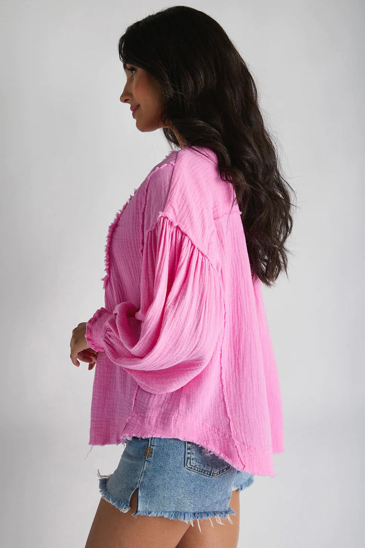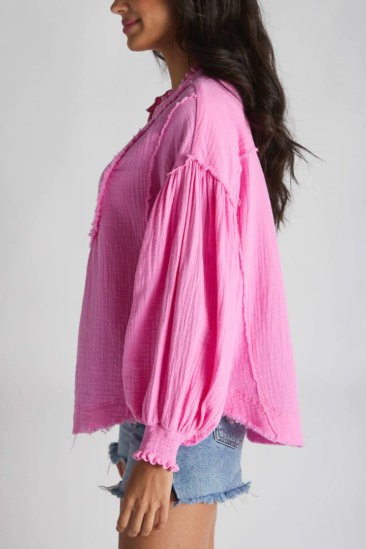 Gauze raw edge long sleeve shirt. Features a ruffle detail V-neckline, drop shoulders, exposed seams, balloon sleeves and a boxy relaxed silhouette.