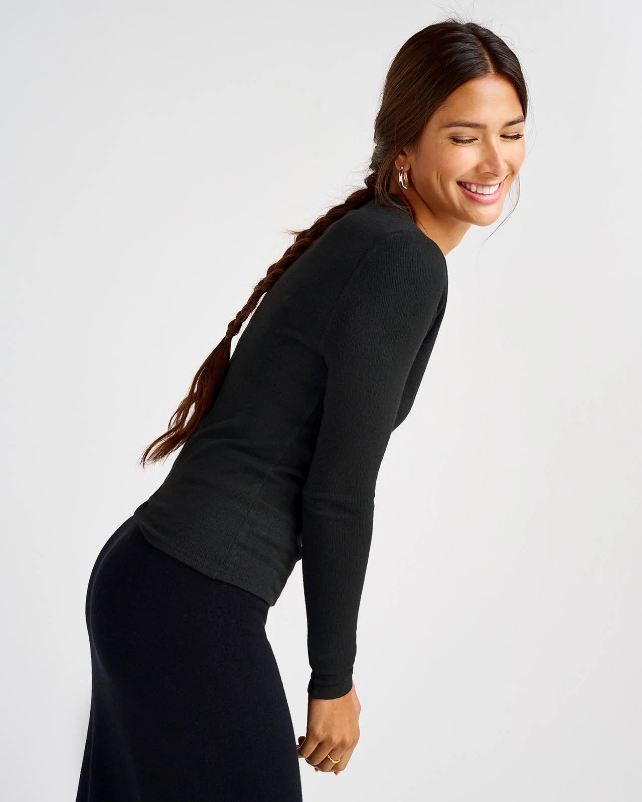 Isabella is an essential fitted tee with a hint of shine for a subtle holiday sparkle. Crafted from stretch jersey with a thin rib texture, this long sleeve tee is perfect for layering and tucks into joggers and jeans with ease.