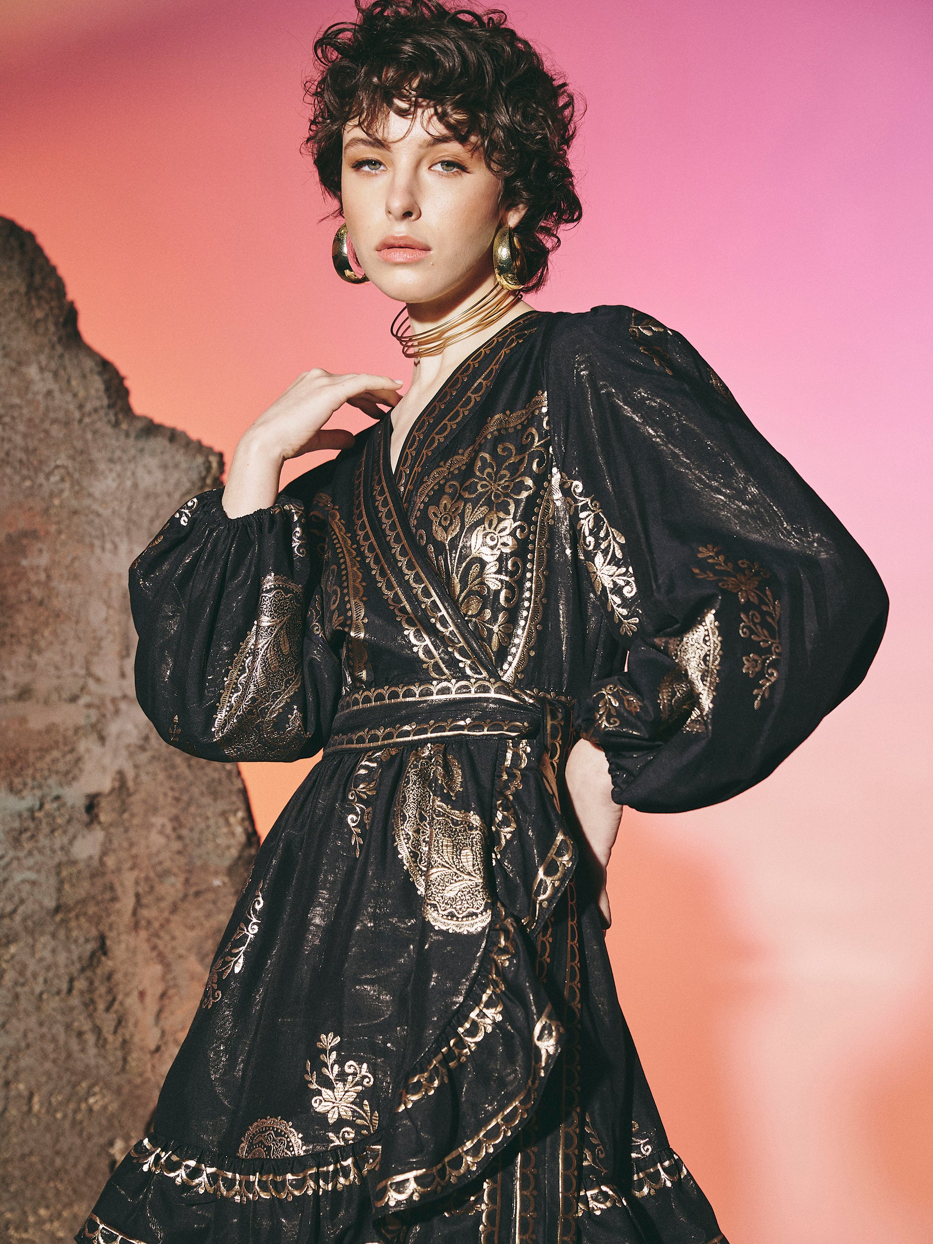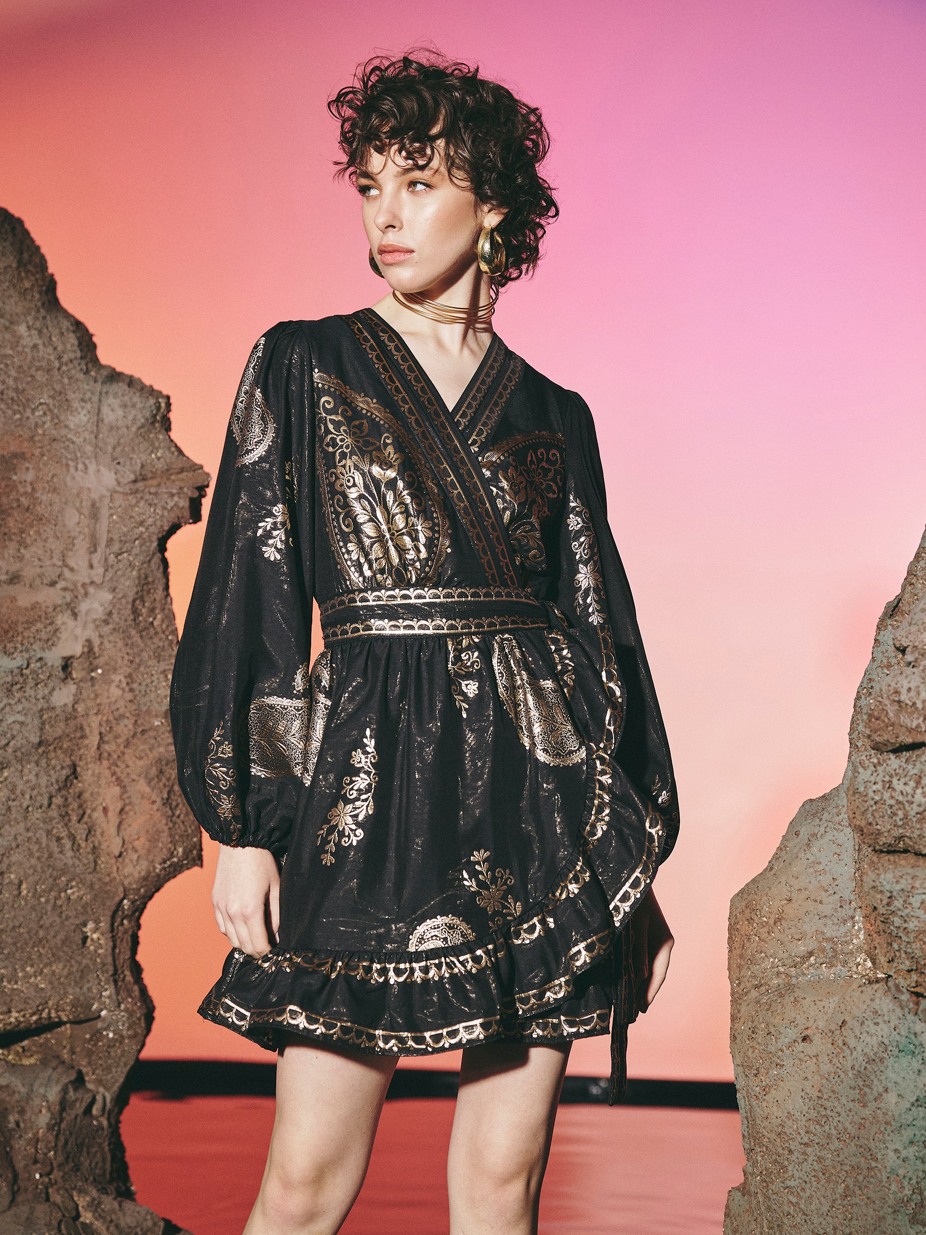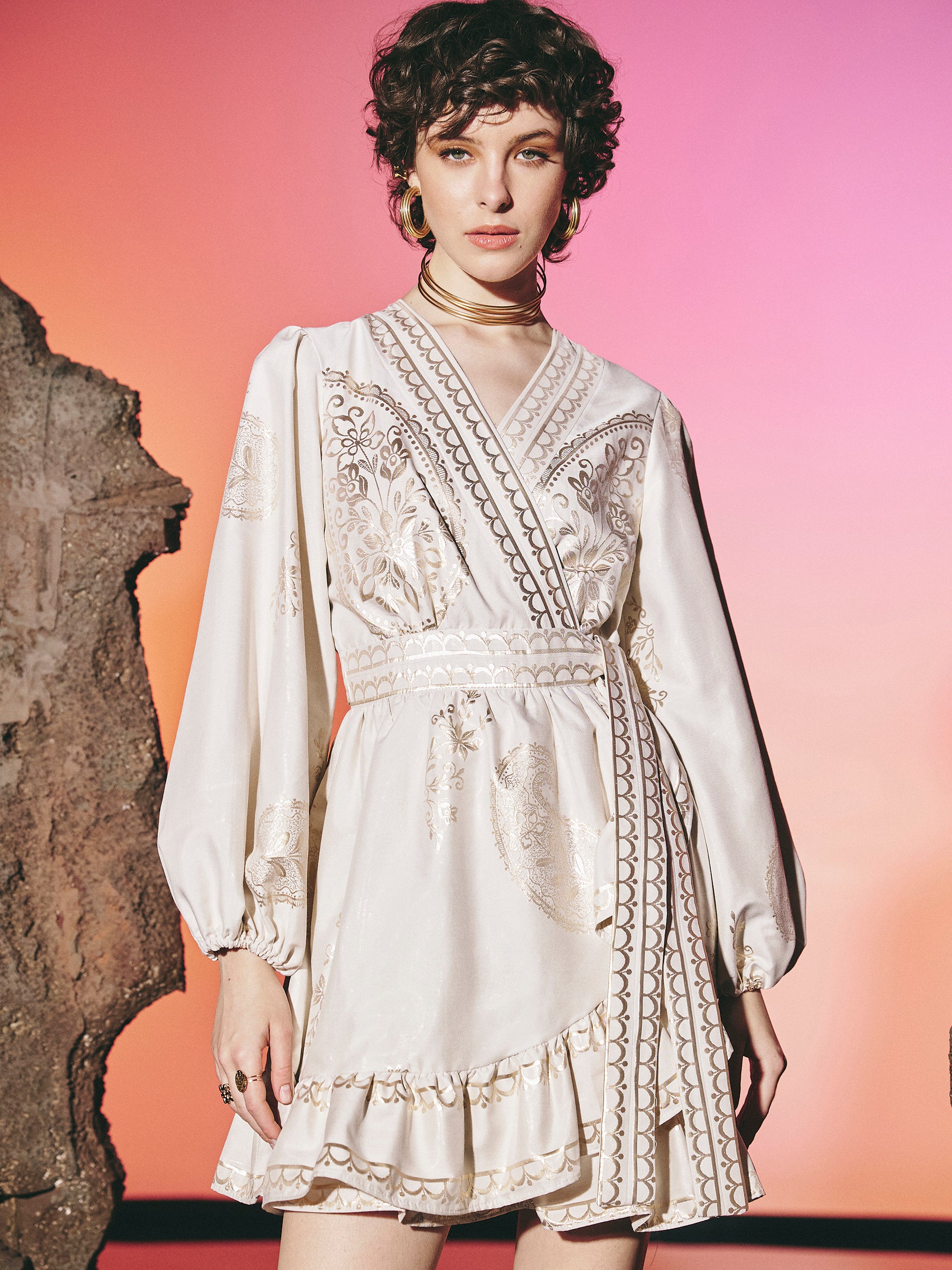 Lace mini dress in a wrap design featuring long balloon sleeves, a matching detachable belt, ruffled details on the hemline and embellished with a jacquard motif. Luxury pieces stand as a testament to meticulous craftsmanship and impeccable attention to detail. The exquisite artistry behind each piece ensures that you’re not simply purchasing a garment but rather a masterpiece.