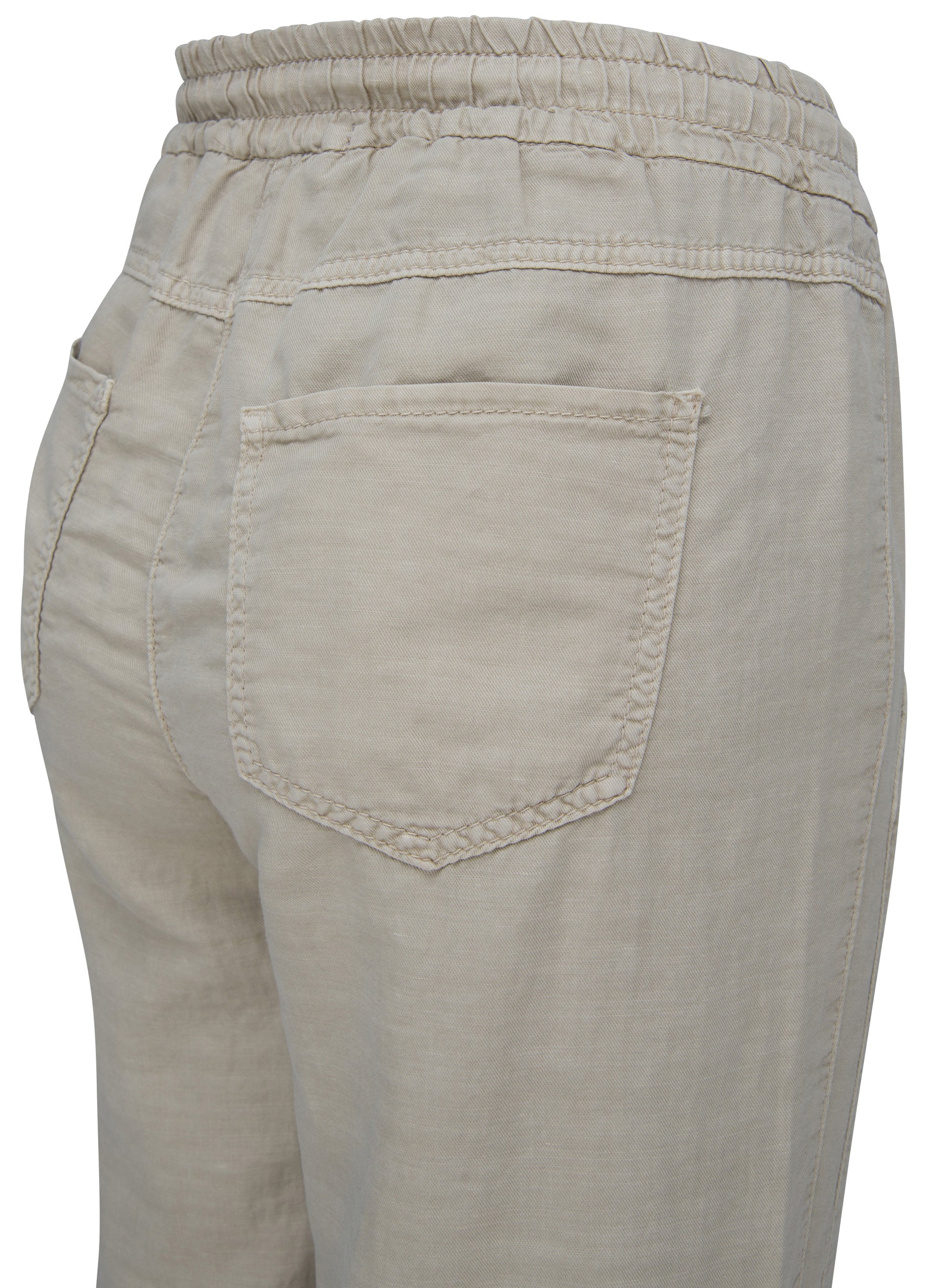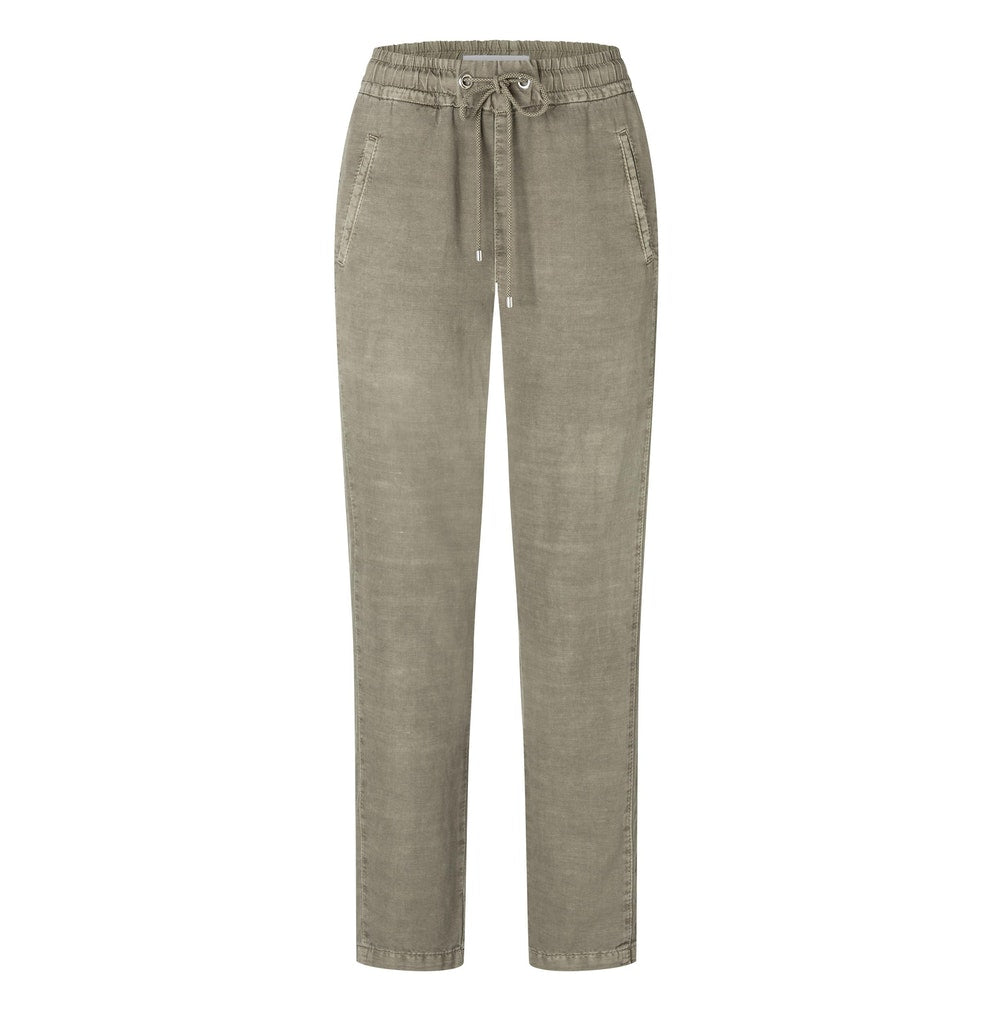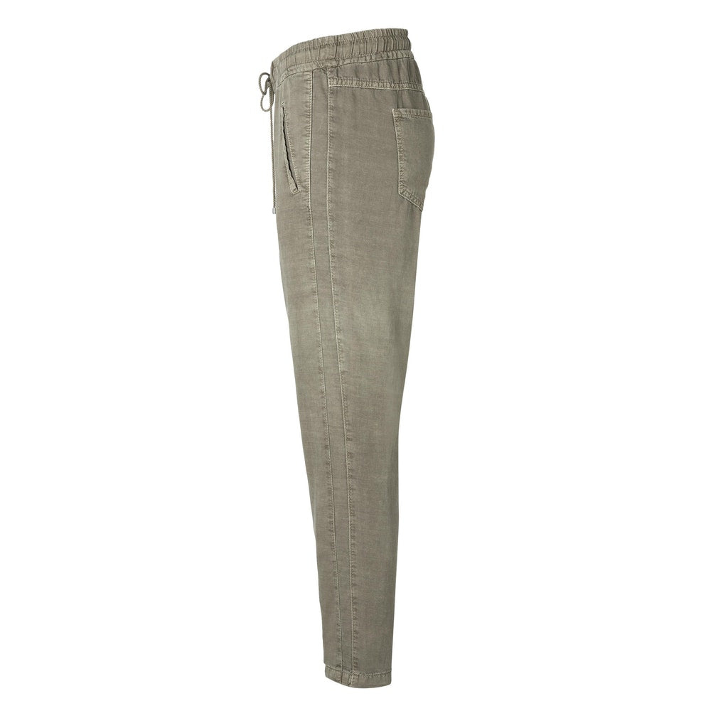 Relaxed fit. Slim leg comfortable waist elastic waistband. Patched back pockets. Slanted piped pockets.