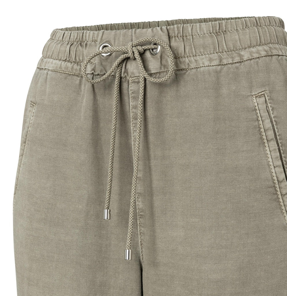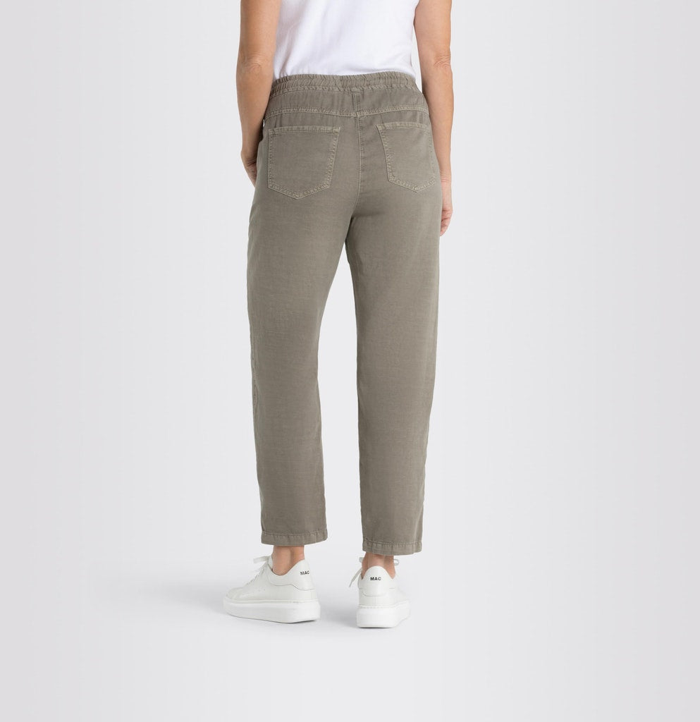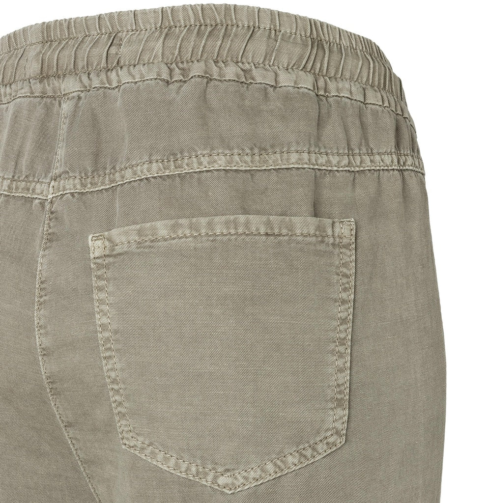 Relaxed fit. Slim leg comfortable waist elastic waistband. Patched back pockets. Slanted piped pockets.