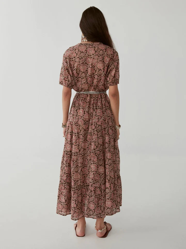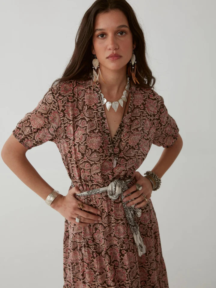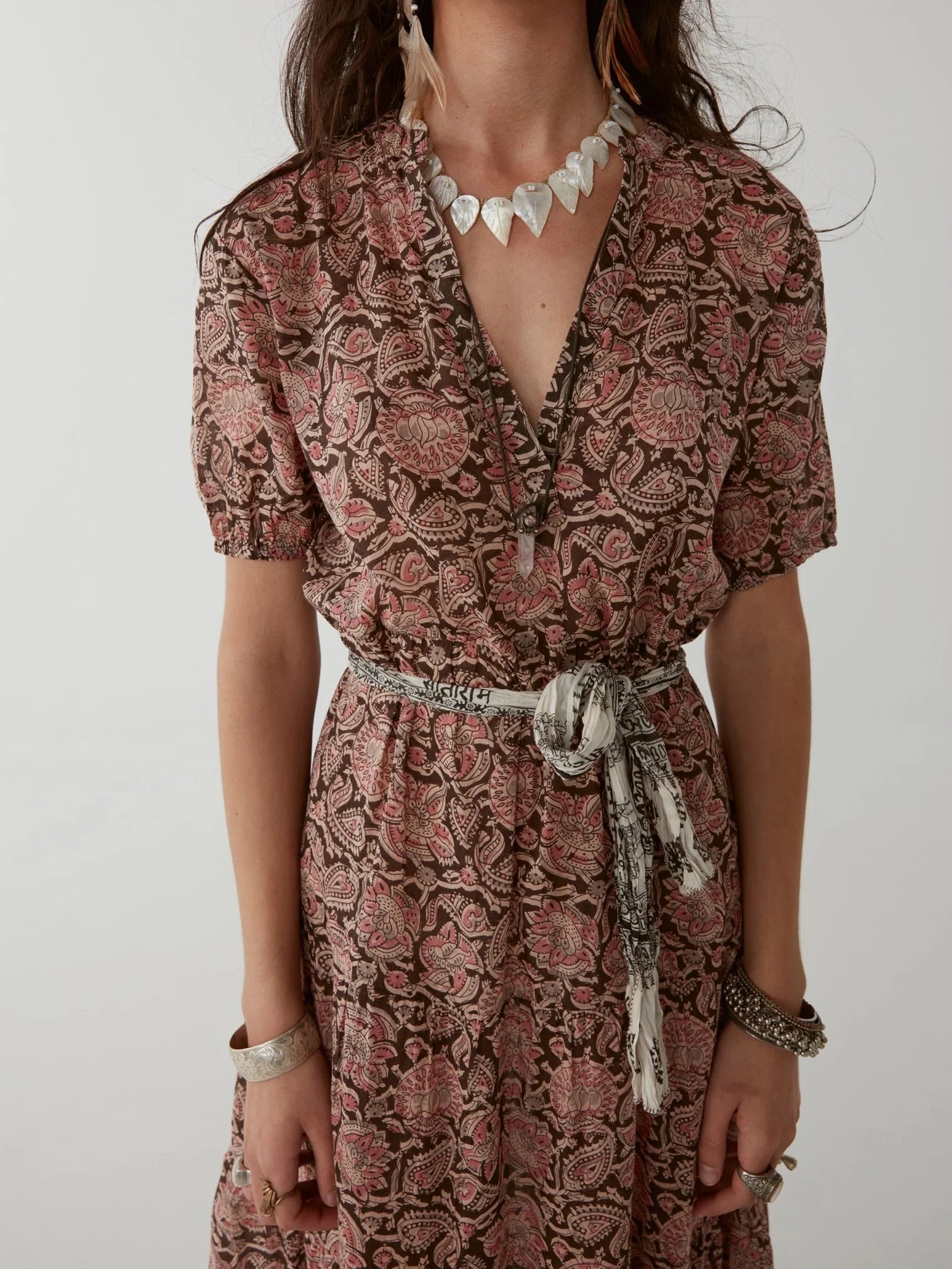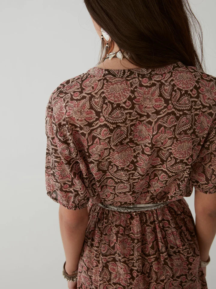 A slightly more generous v-neck and elastic cuffs, the dress is rendered in super-soft cotton voile.