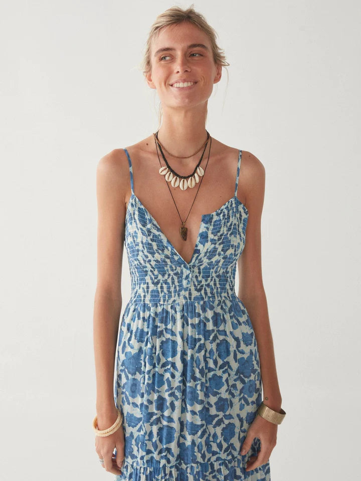 Cut in fantastically soft viscose modal, the indigo floral dress features a smocking and half-button chest, allowing for multiple combinations.