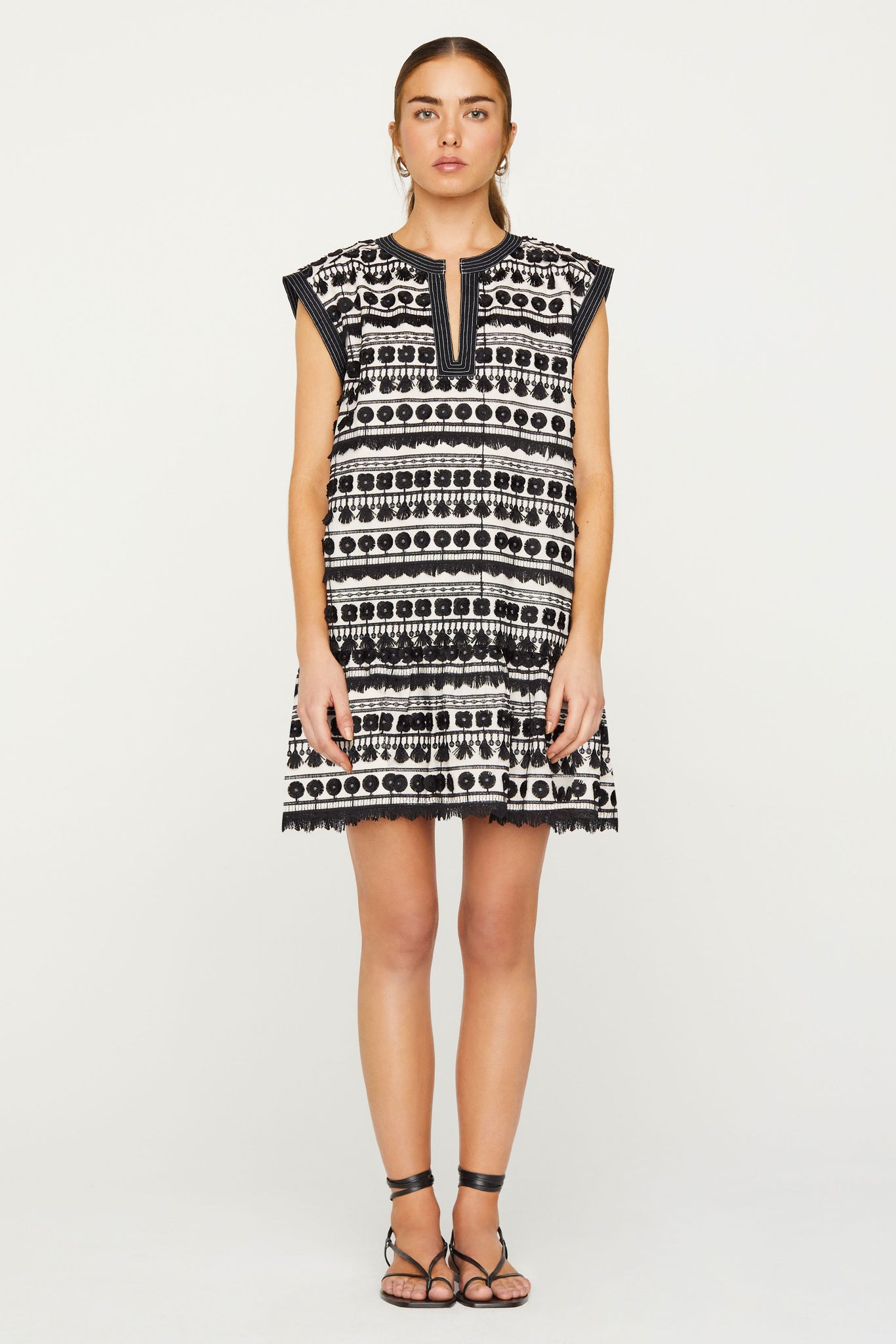This slip-on mini has great lines, but it’s the textural elements that have earned this repeat silhouette fans of all ages: trapunto stitching along the neckline and sleeves as well as eye-catching Indian embroidery and fringe detailing. Herra is pictured here in our striking black-and-white Yang colorway.