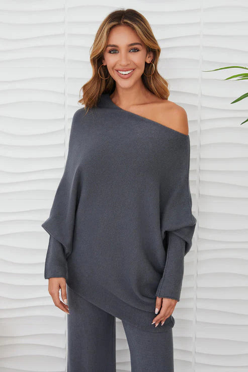 This long sleeved asymmetrical mock neck sweaters in a sleek modern silhouette. An ideal piece for transitioning from day to night.