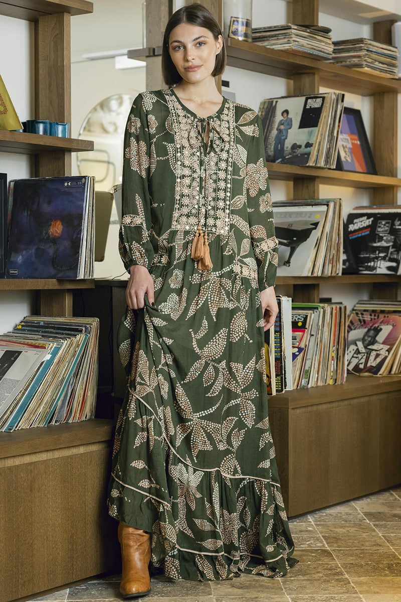The Daphne dress is both comfortable and elegant. With its floral print and embroidered chest section, you get the perfect bohemian-chic look. A loose shape with a tiered skirt in a silky khaki viscose with a pale pink and beige print and beautiful embroidery around mirrors on the torso and sleeves, a khaki viscose jersey slip dress