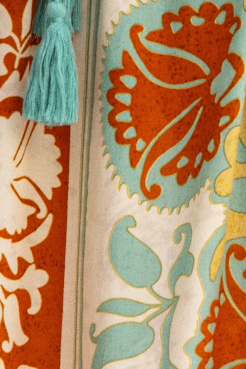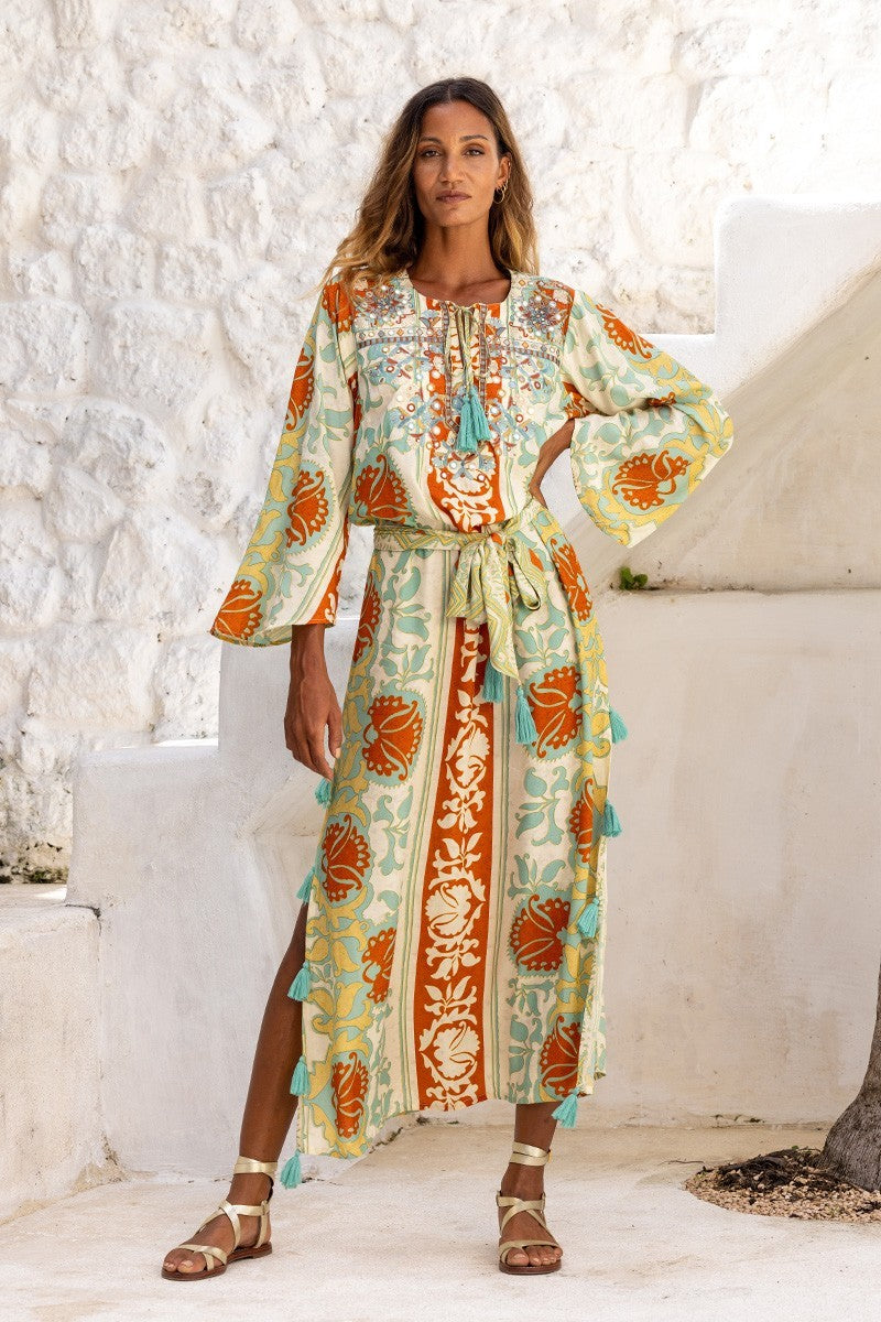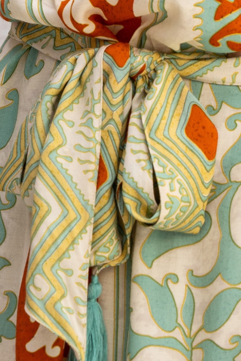Don't forget about the bohemian print this season with this stunning dress. This gorgeous piece features a matching belt to enhance the waist, and detailing around the neckline and a pair of pom-poms at the end of the bow for an elegant finish. Crafted in a luxurious range of colors, this is a very delicate and comfortable dress to wear. Complete the look with bold heels or a pair of sandals for a sophisticated summer look.