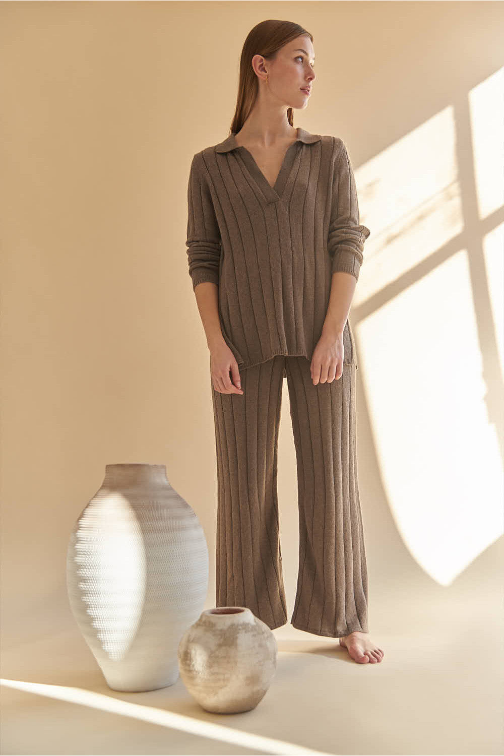 Thick ribbed knitted trousers.