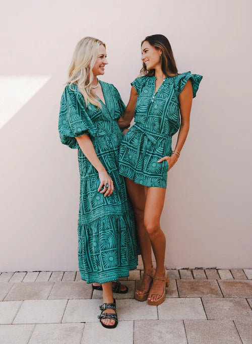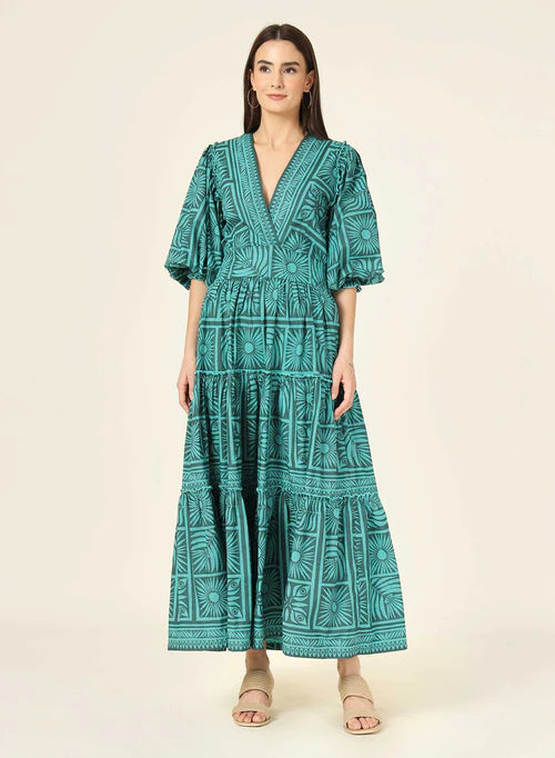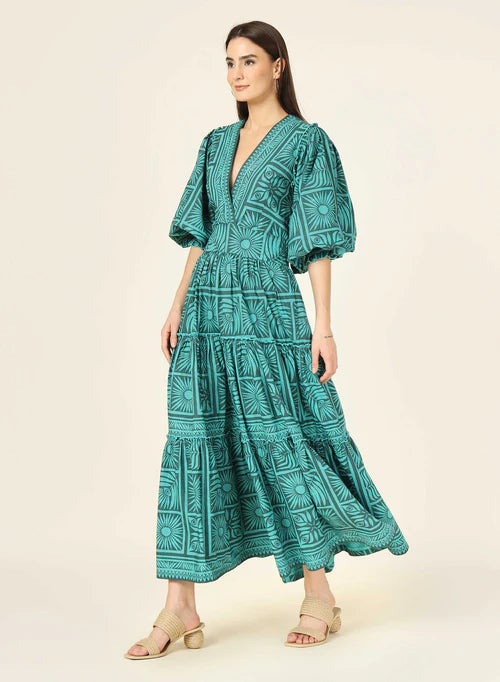 An elegant look that's oh-so-perfect for summer evenings, this breezy full-length Sloan Maxi caftan-style dress adds a key piece to your wardrobe. Sleeves with a smocked cuff can easily be adjusted -- push them up or pull them down. Fun bubble sleeves, a v-neck, and a tiered flowy skirt pair perfectly with wedges and a clutch to make a statement no one will soon forget.