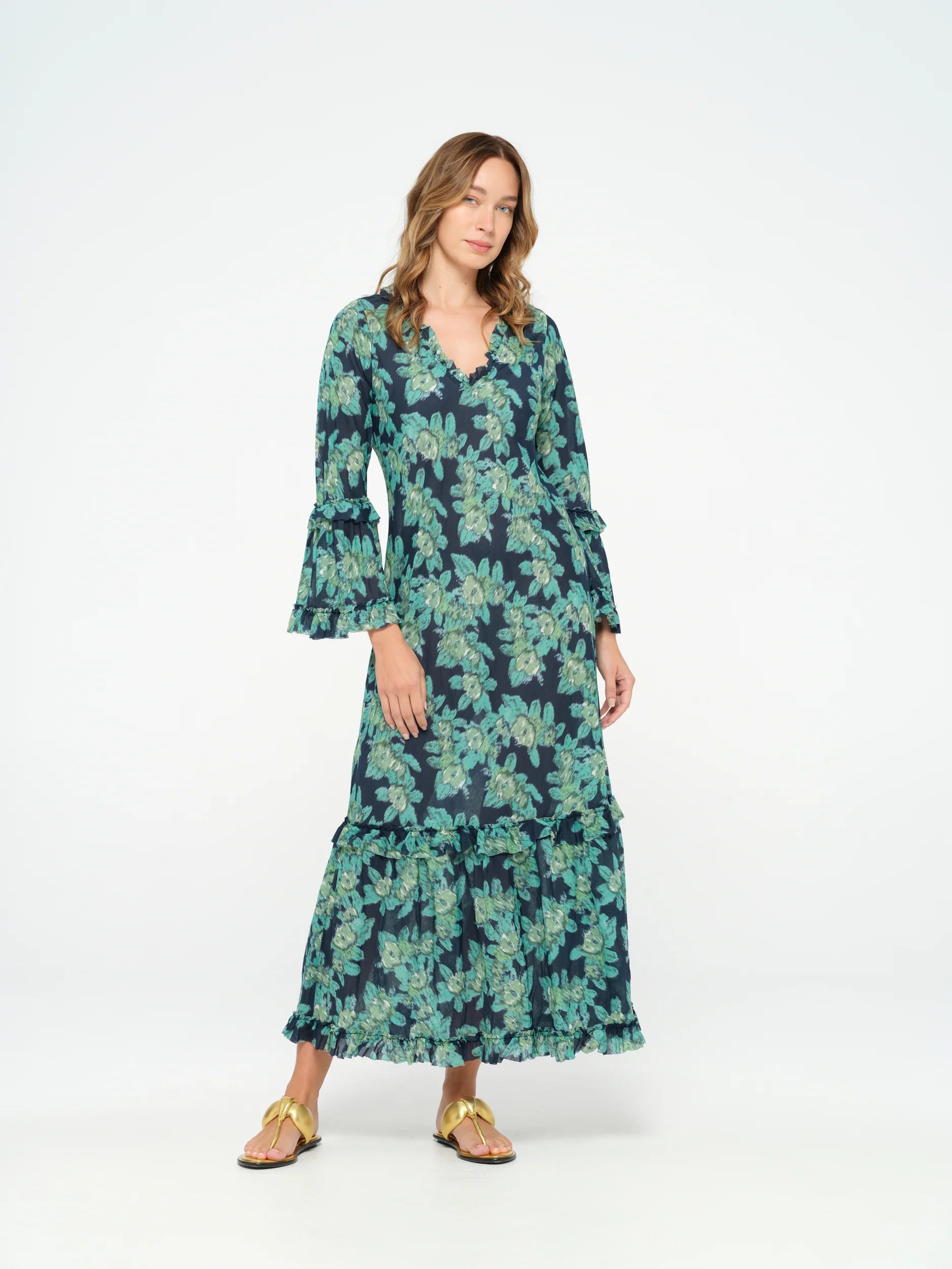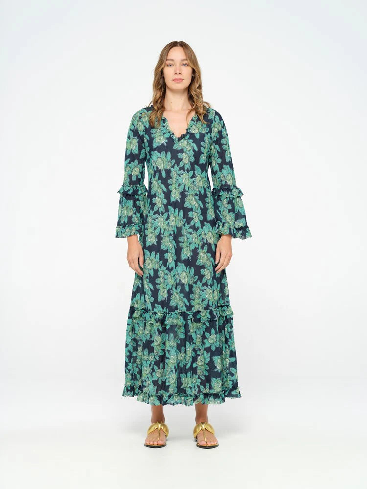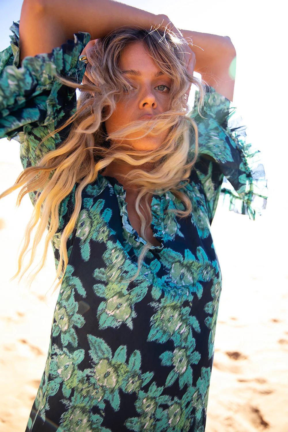 The Long Indi is our one season show stopper. The bias-cut dress, flowing fit, jumbo frills and accentuated sleeves make it effortless by day and a centerpiece by night.