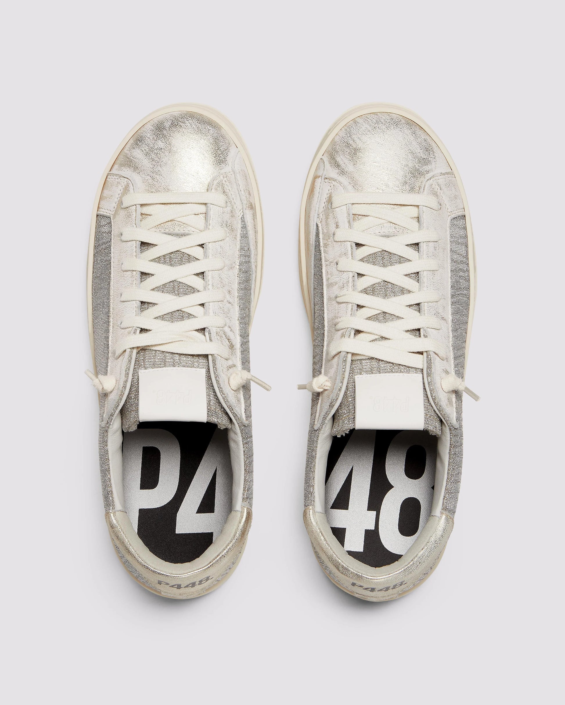 Our P448 designs push the boundaries of footwear by choosing unique specialty materials, some of which require particular care. This includes haircalf, glitter, denim, sponge, and others. These materials are often delicate and difficult to clean. Try to avoid wet or muddy areas when wearing and bring to a cleaning expert when dirty or stained.