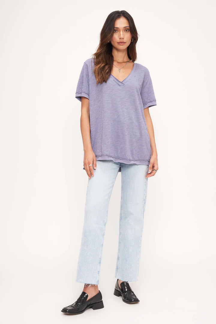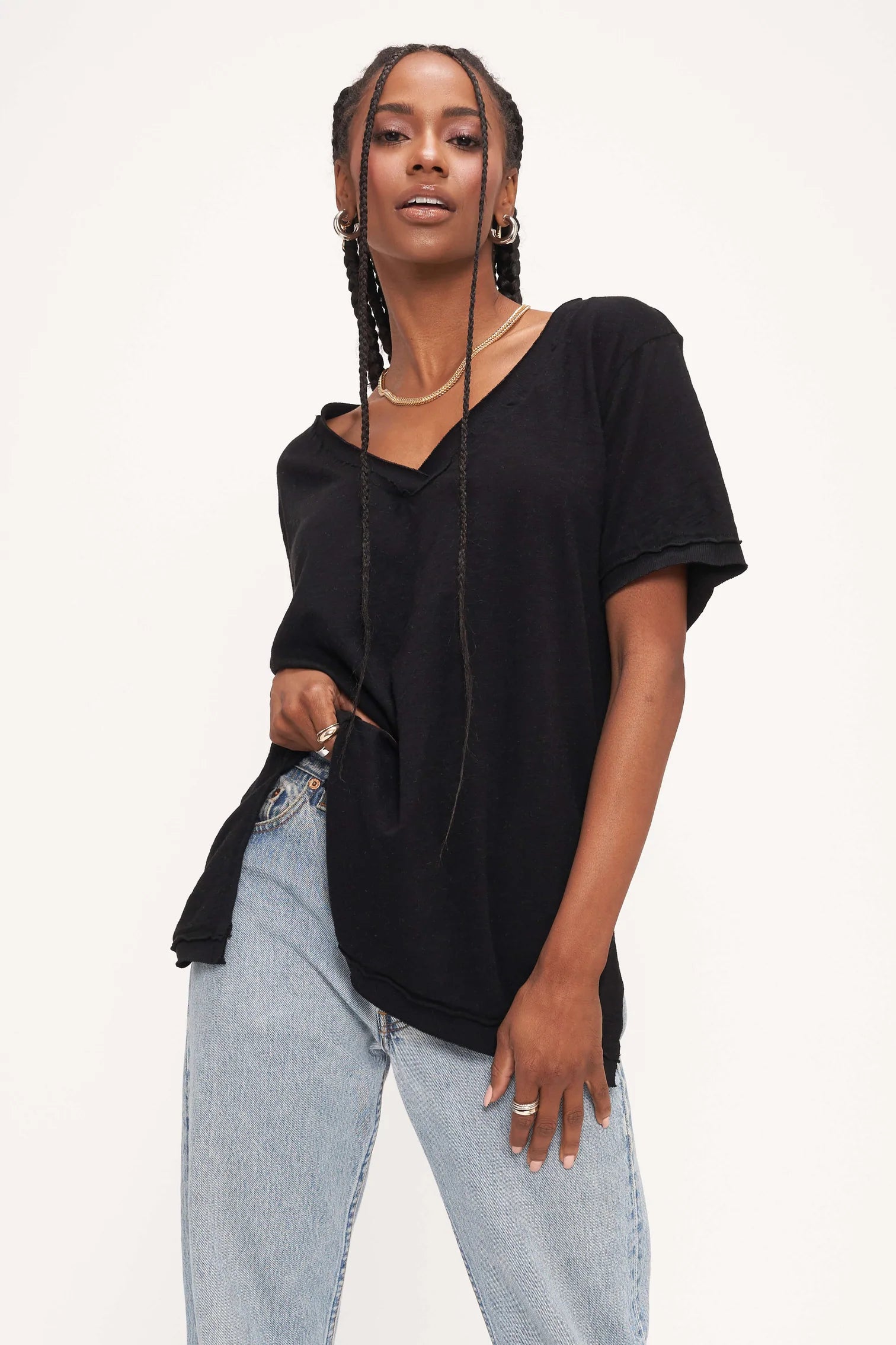 Our Knock Out V Neck Tee is a revamped play on your typical boring tee. With a relaxed v-neckline and slit side seams, and contrast rib bands throughout, this tee hangs in all the right places. Combine that silhouette with our signature 100% slub cotton fabric, and you've got your next favorite tee.