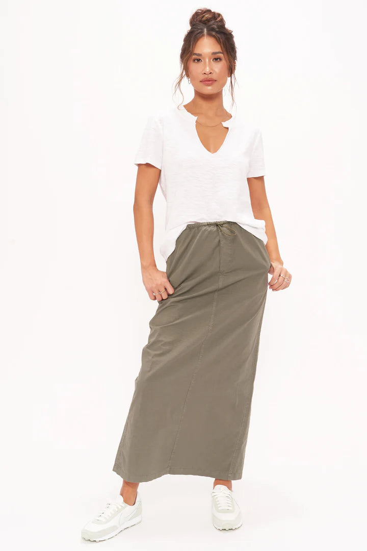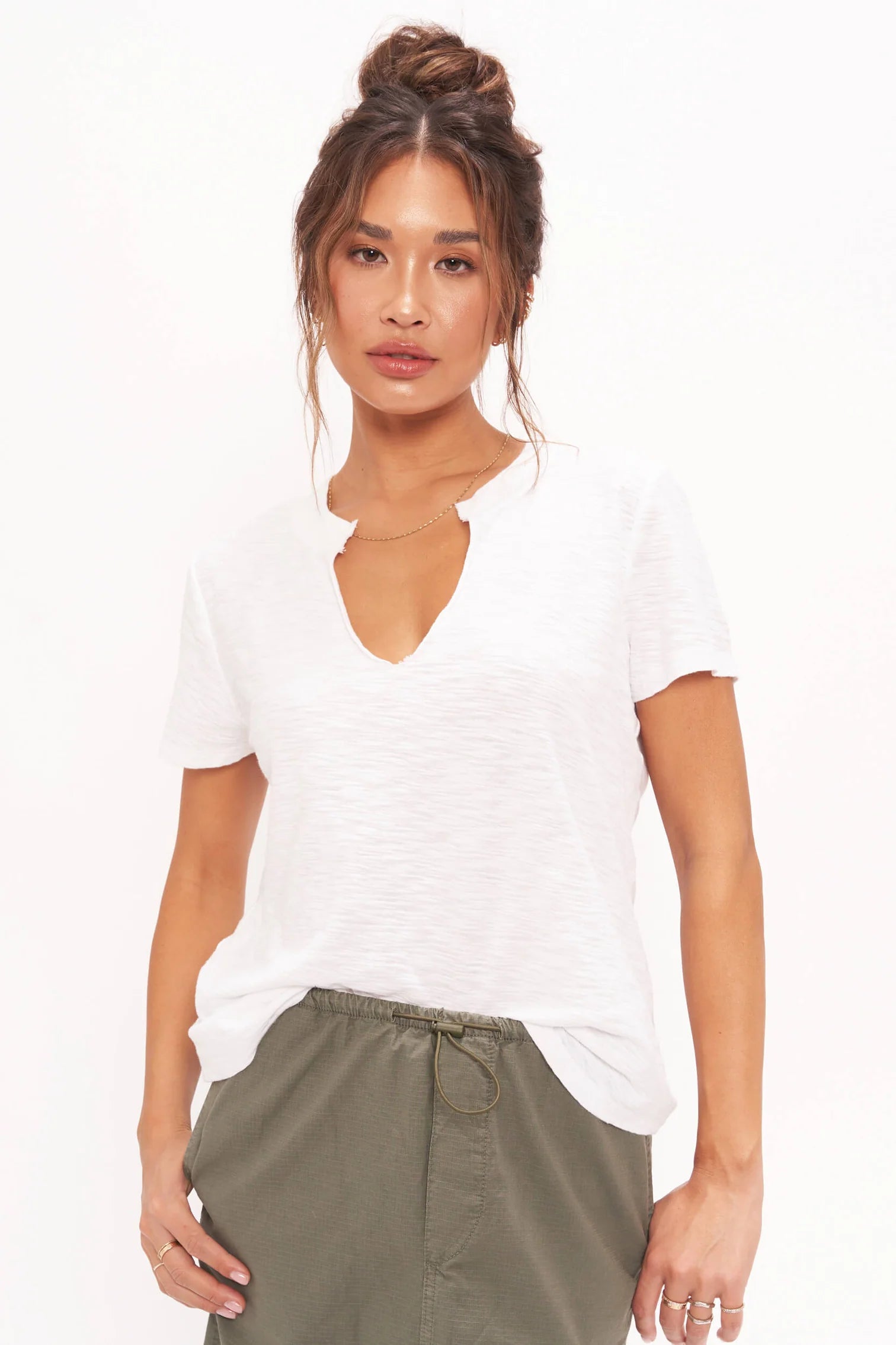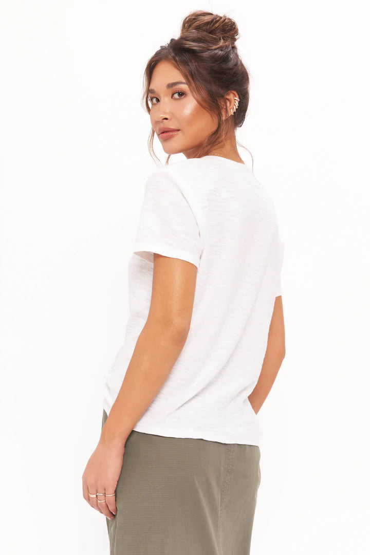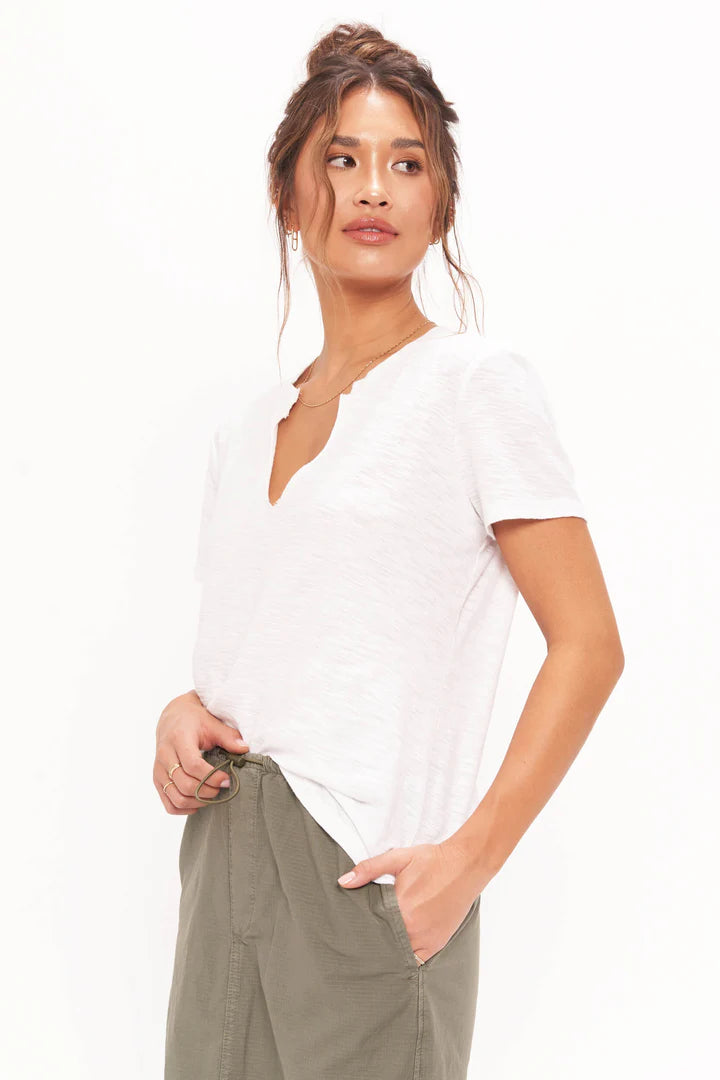 Our Plata Notched Tee features a notch neckline with raw edges and a gentle slim fit, giving it a well-loved, vintage feel. The perfect complement to a "tee and jeans" type of day with sneakers or night with heels.
