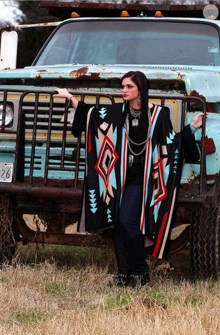 Gorgeous southwestern patterned poncho accented in fabulous fall colors of blood red, turquoise & taupe against a black background.