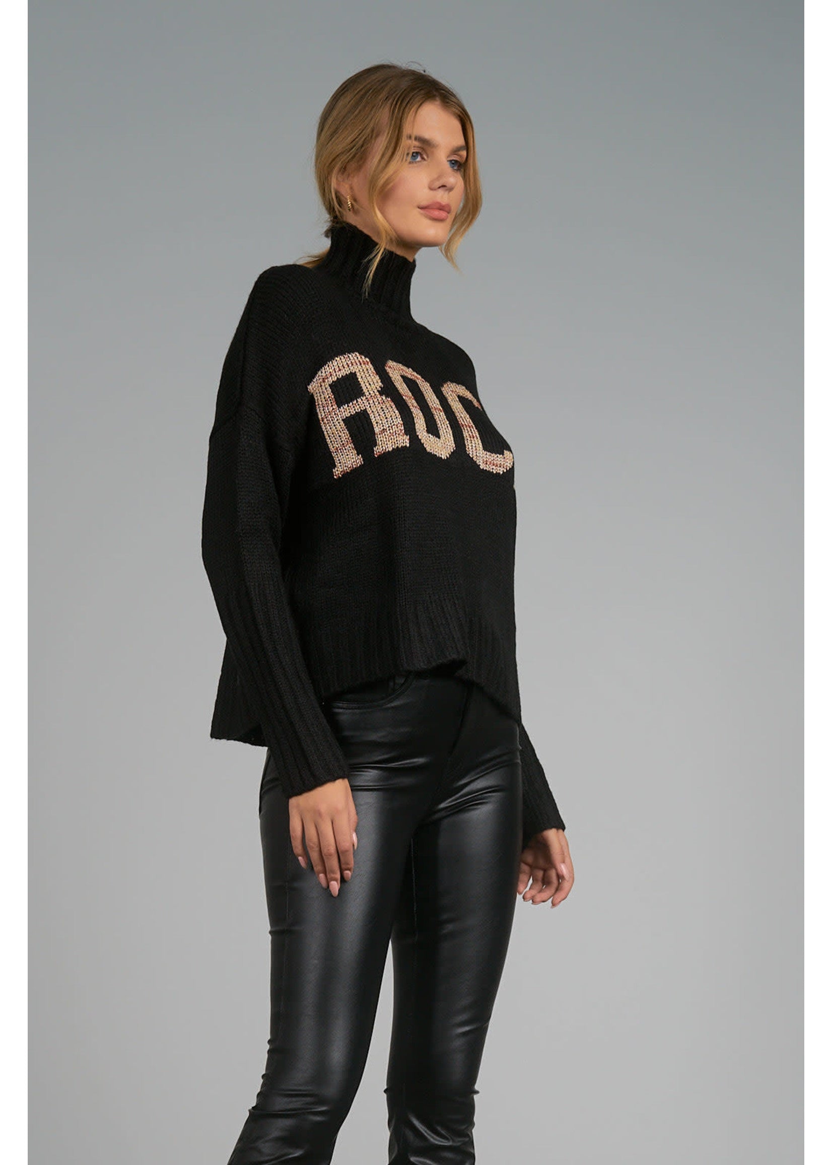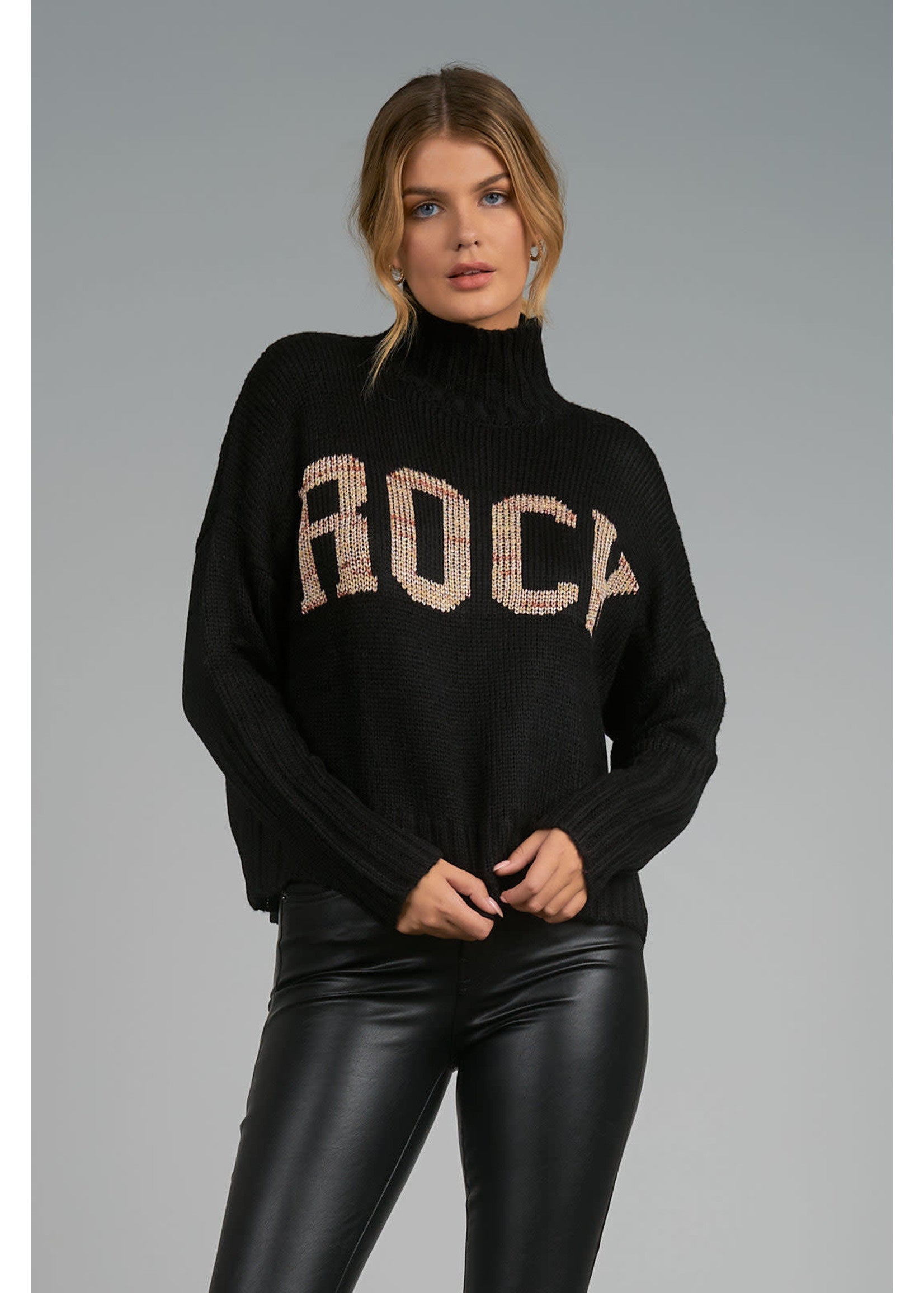 Express your unique style in this black lightweight mock turtleneck sweater with "ROCK" in gold/rust lettering. Pair with your favorite faux leather pants and booties and you are ready for a night out! Features longs sleeves, relaxed bodice, mock turtleneck, straight hemline that falls to waistline.