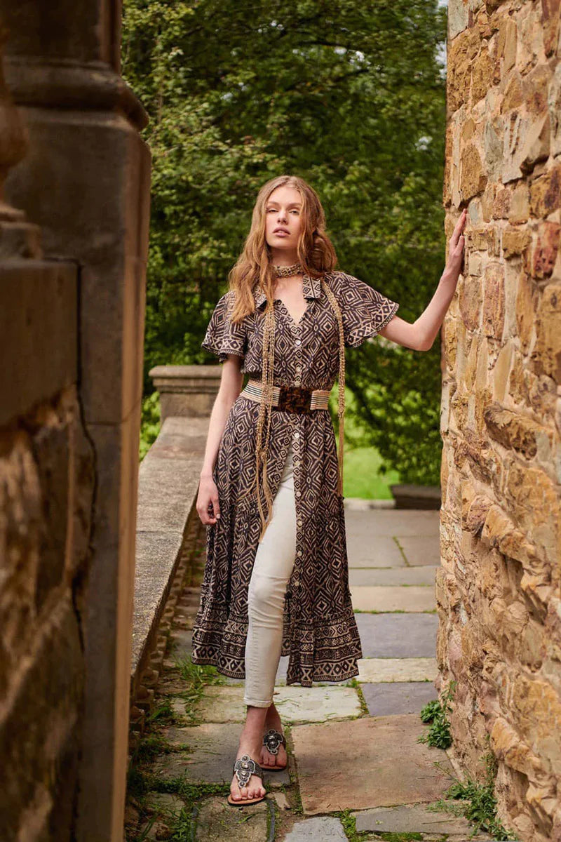 With its fluid silhouette and crafted from a lightweight fabrication, the Rubyyaya Aztec Maxi Dress is the epitome of go-with-the-flow. Featuring agoya shell buttons and frill hemline, we like to keep it casual by pairing this maxi with sandals for an everyday look.