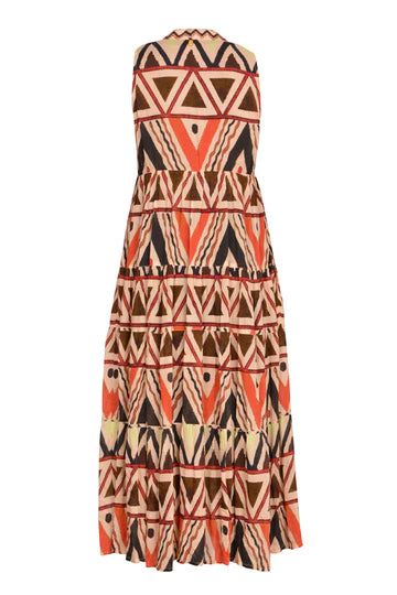 Enliven your wardrobe with this sleeveless tiered midi dress in our exclusive eye-catching Dana geometric print. This 100% rayon dress breathes like cotton and drapes like silk.