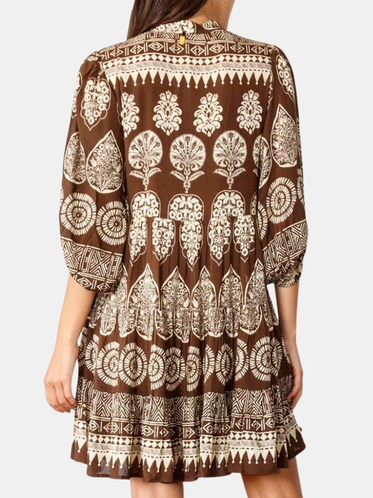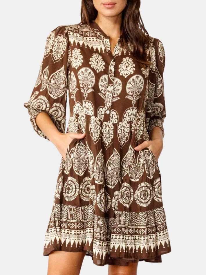 The Jaipur Dress by Ruby Yaya features a buttoned front, long sleeves with elasticated cuffs, concealed side pockets, and a mini length. Shown in Brown. This dress will take you from season to season, this timeless version is perfect to style solo with a staple boot in the cooler months, or with sandals in the warmer months.