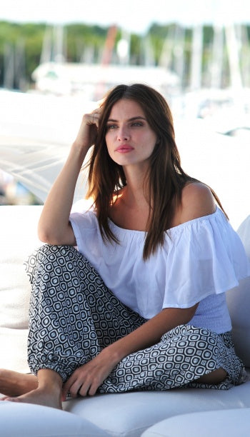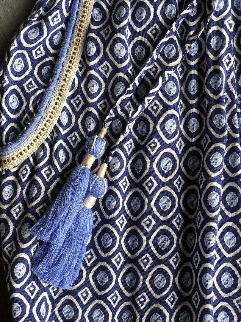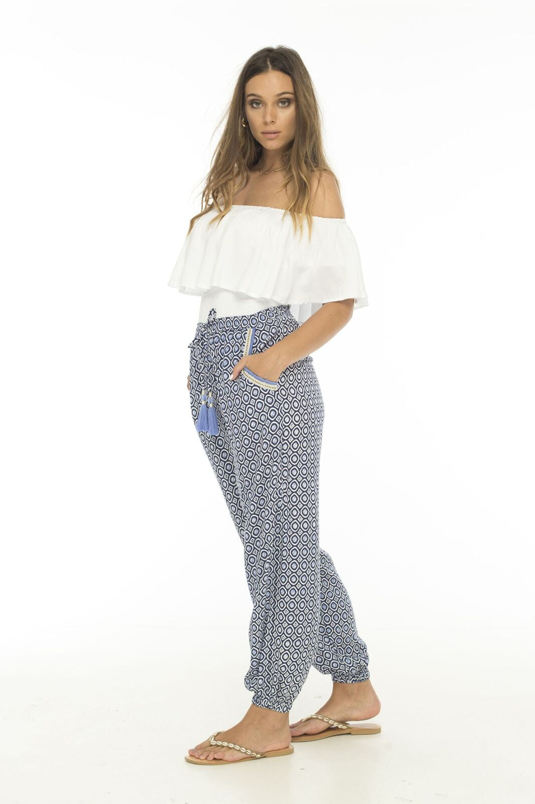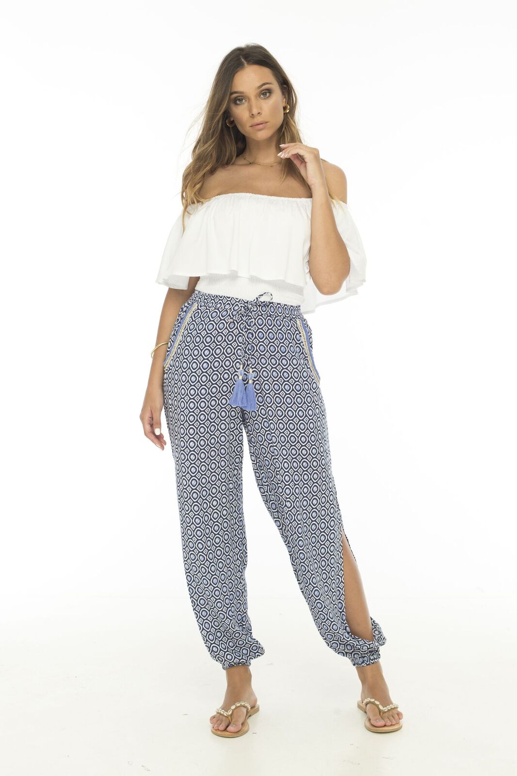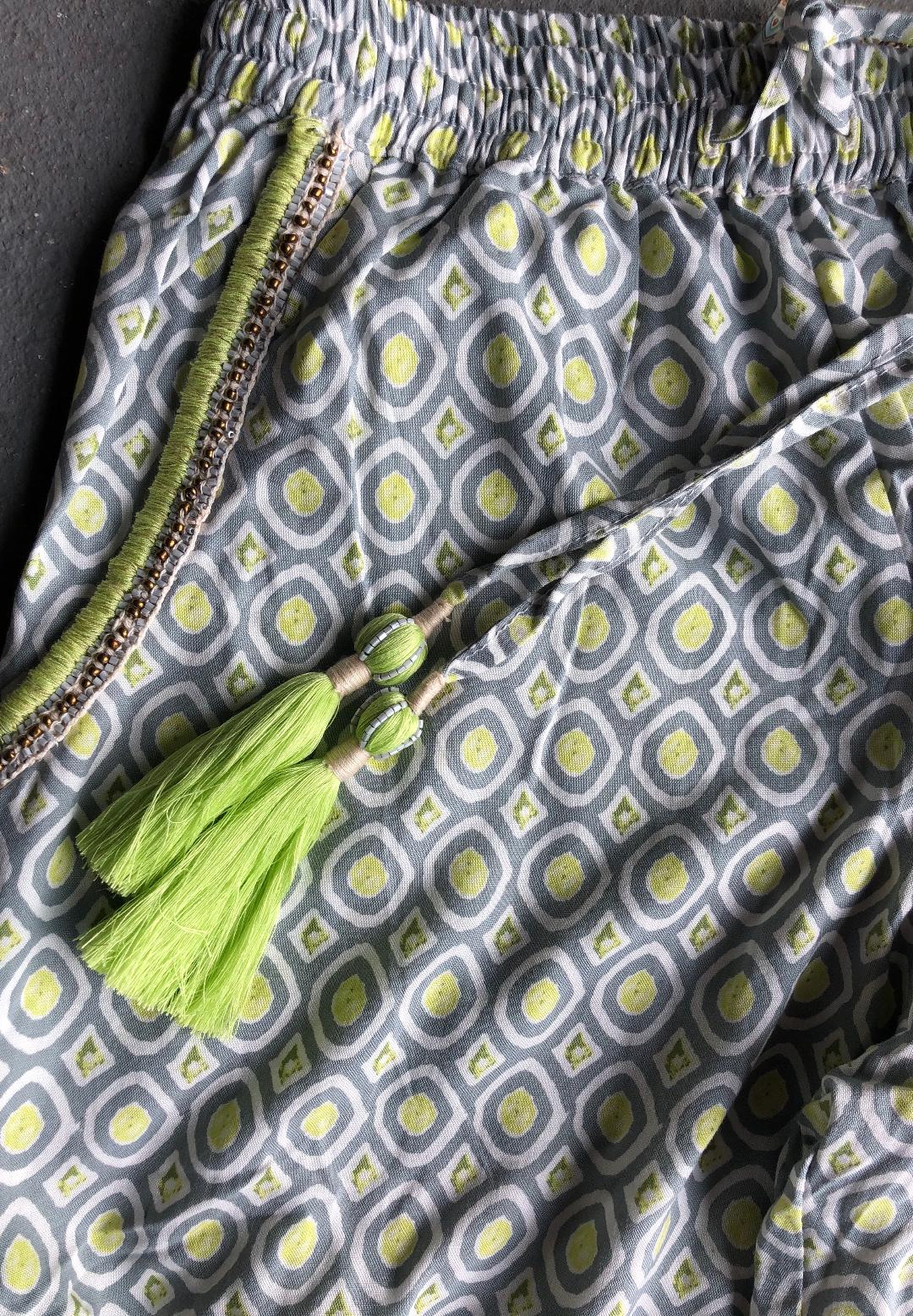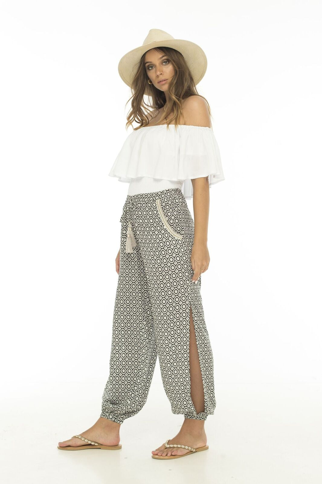 They're magical for a reason! Fab geometric pattern with gorgeous embroidery, bead trim detailing around pockets and fun slit up the side, gathered around the ankle, plus tassel drawstring detail the magical pant is a "must have" in your wardrobe. They definitely have that relaxed summer vibe but can be dressed up to look glam for the evenings. Relaxed yet sexy!