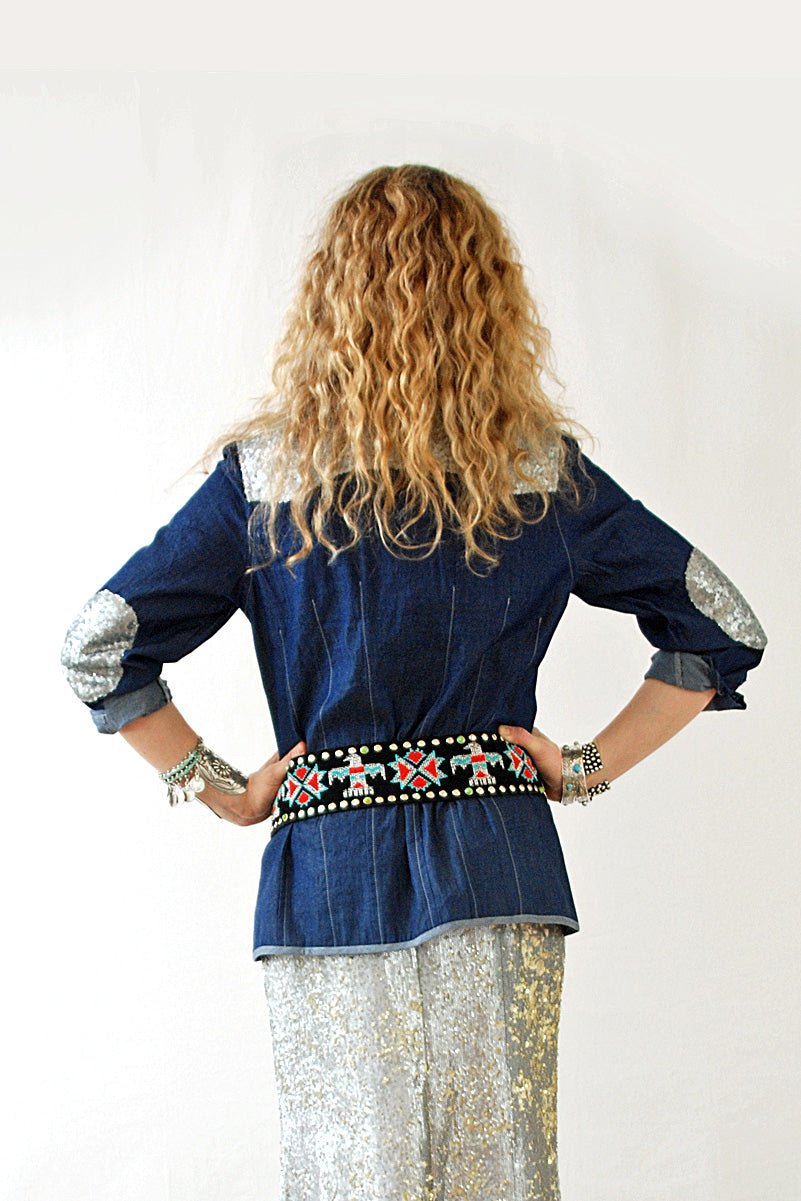 Western-chic denim shirt with sparkle detailing. Get ready to shine in the Roxy Denim Shirt by Tasha Polizzi — a standout take on classic western denim with a touch of glam. With its silver sequined yoke and elbows, snap closures, and structured yet wearable silhouette, it bridges rugged and refined.