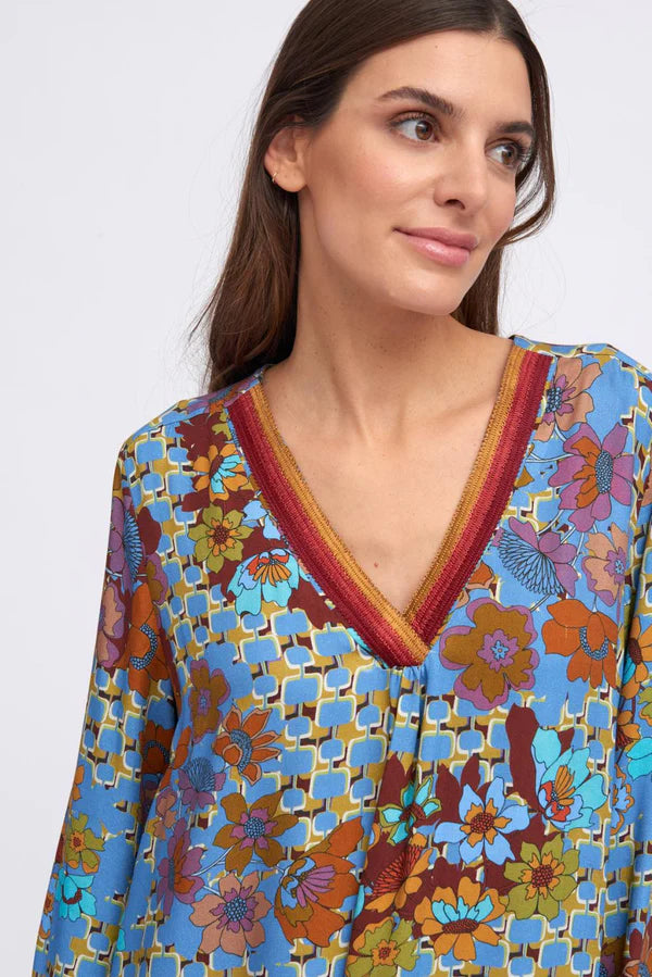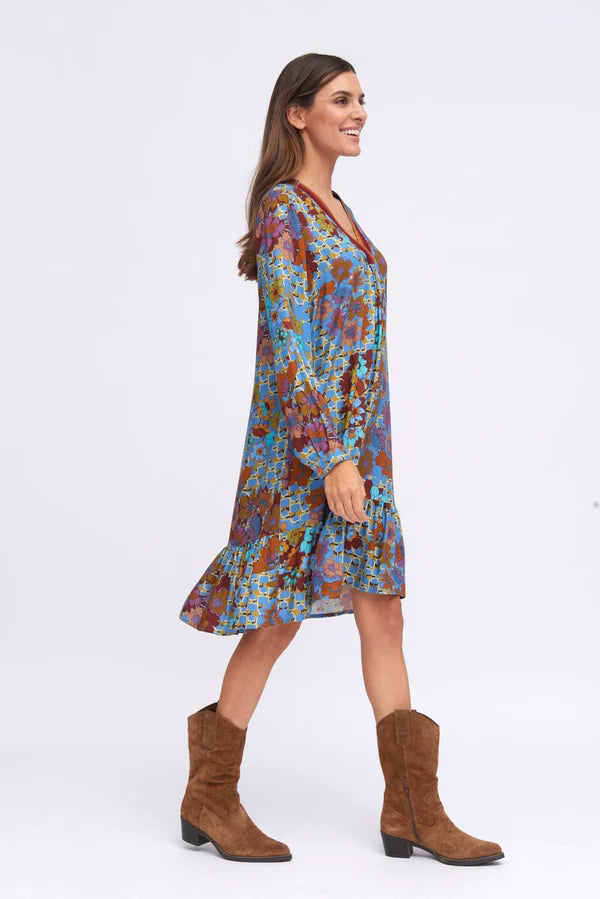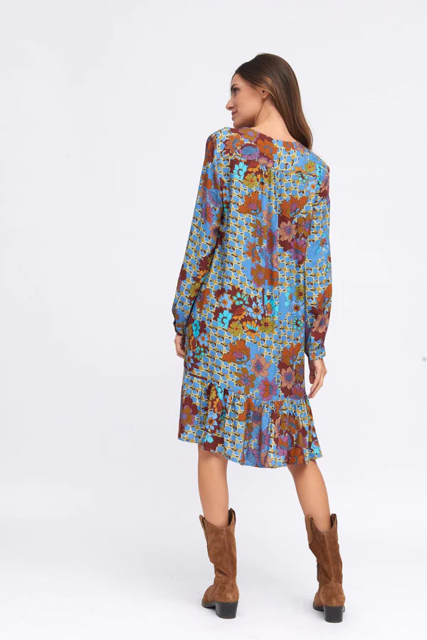 Short dress with geometric and floral print. Fluid fabric with movement. V neckline with striped ribbon detail. Straight cut. Long sleeves with cuffs and button closure. Straight hem with ruffle detail and slight volume.