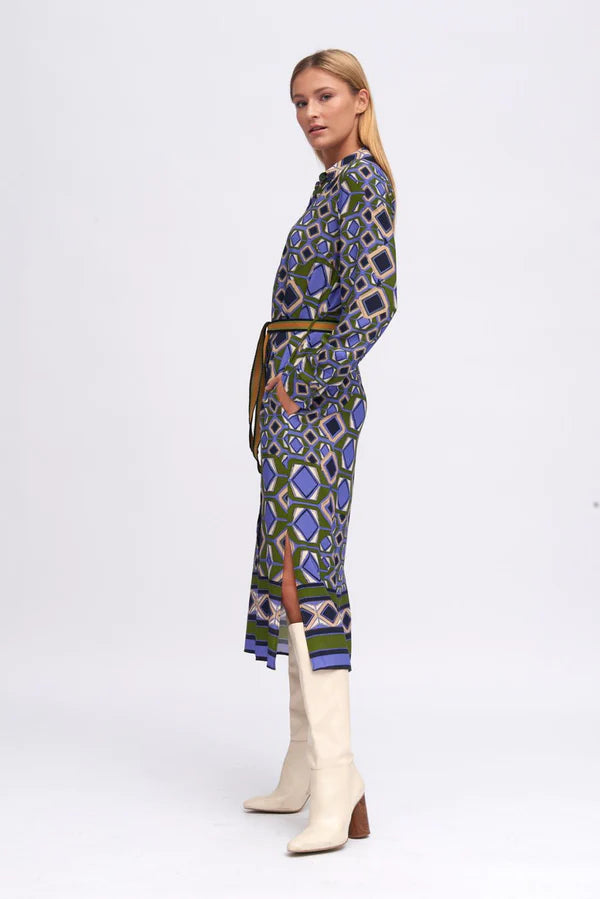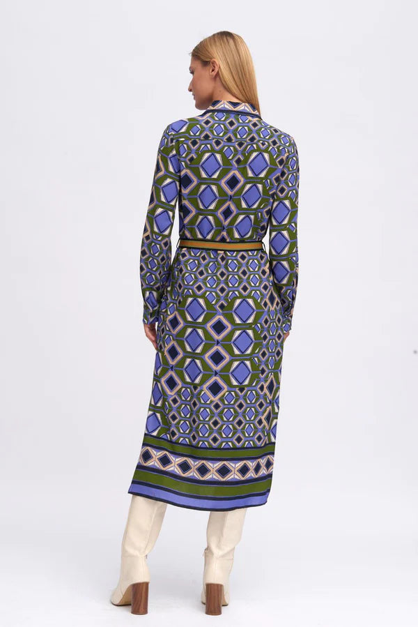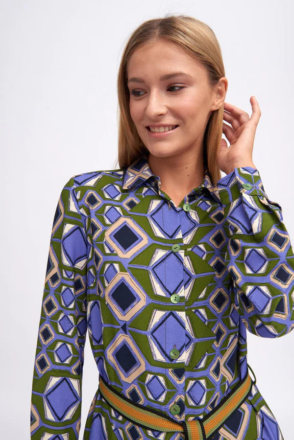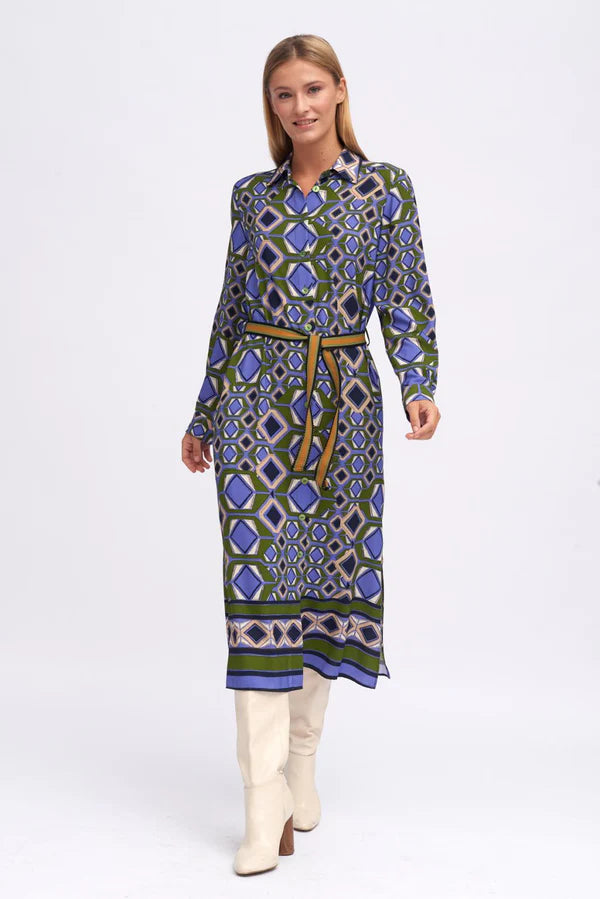Midi shirt dress with geometric print shirt collar. Front closure with buttons all the way down. Long sleeves with cuffs and one button closure. Cinched waist with belt loops and contrast striped belt. Hidden side pockets. Straight hem with slits and slightly longer and rounded at the back.