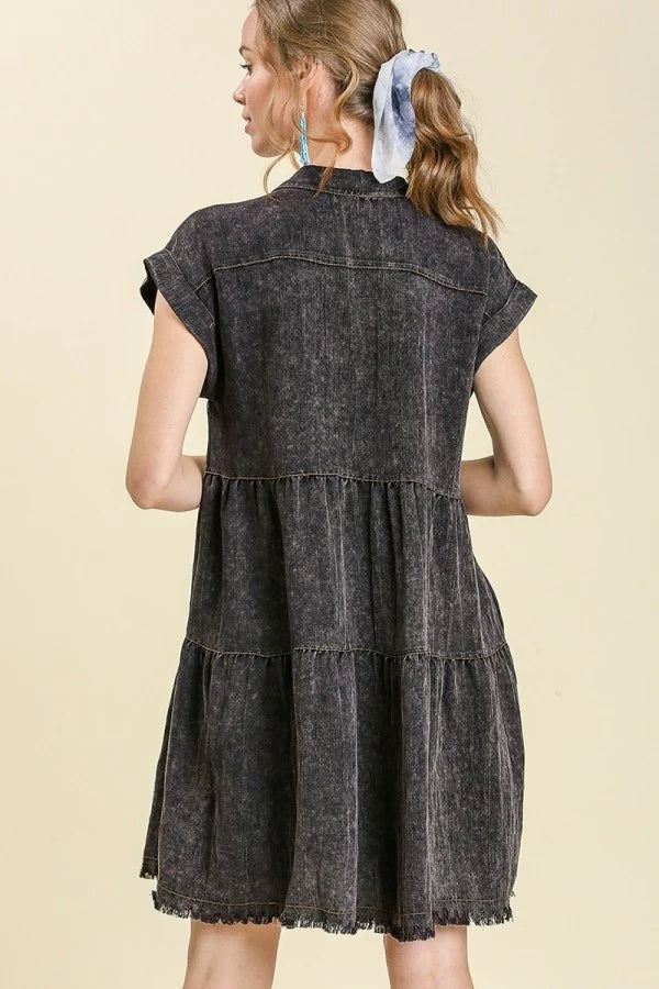 This Umgee dress features a snow washed finish, with contrasting colored stitching, short rolled sleeves, buttoned front, collared neckline, frayed hem, and a tiered ruffled design. It is unlined and a very lightweight material. Fit is true to size.