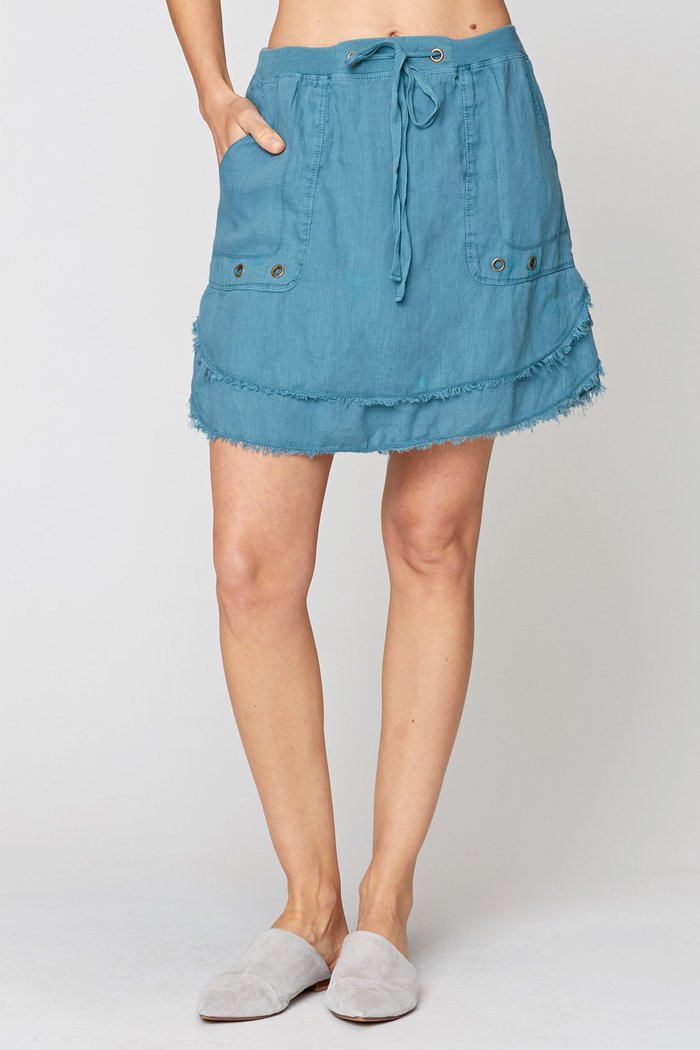 A short pull-on, drawstring skirt with double raw edge tiers and grommet accents on pockets.