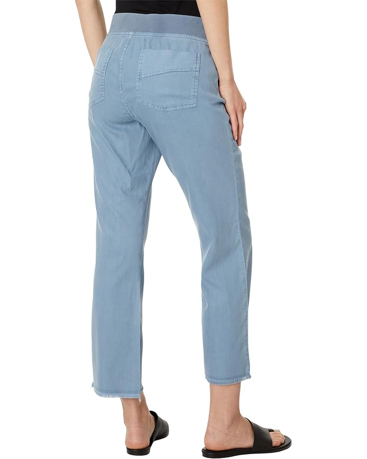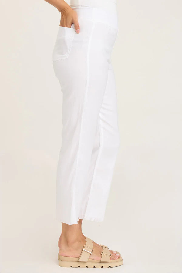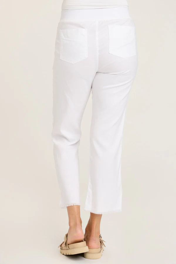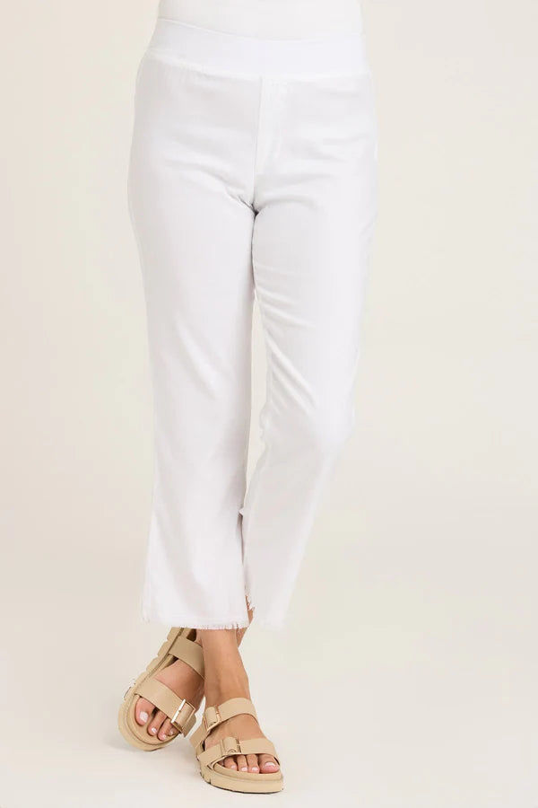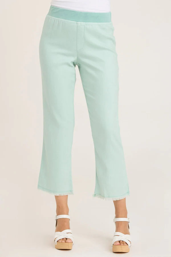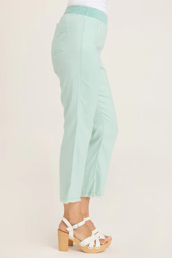 This stretch twill crop is quickly becoming one of our best-selling denim alternative pants. Features a clean straight leg silhouette, elastic pull-on waistband with faux fly, two jean-style back pockets, and raw edge hem.