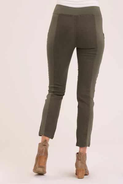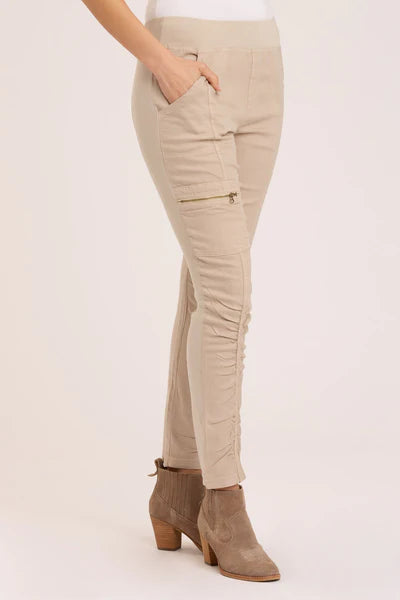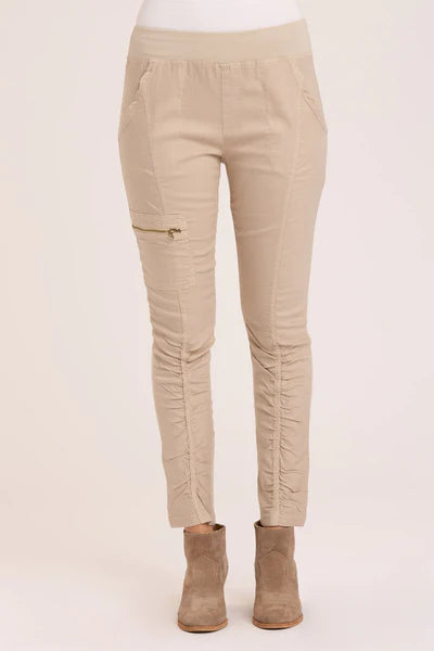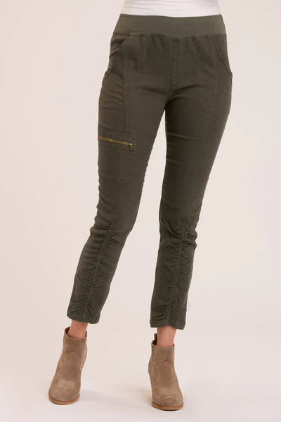 Elevate comfort and style in this newly updated Tencel Twill pant, showcasing jersey side inserts for a flawless fit. An elastic jersey pull-on waistband, dual front pockets, a discreet side zip pocket, and ruching on the front legs for added flair come together in this go-to style.