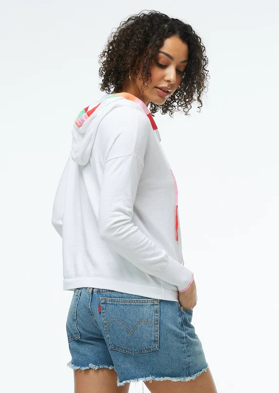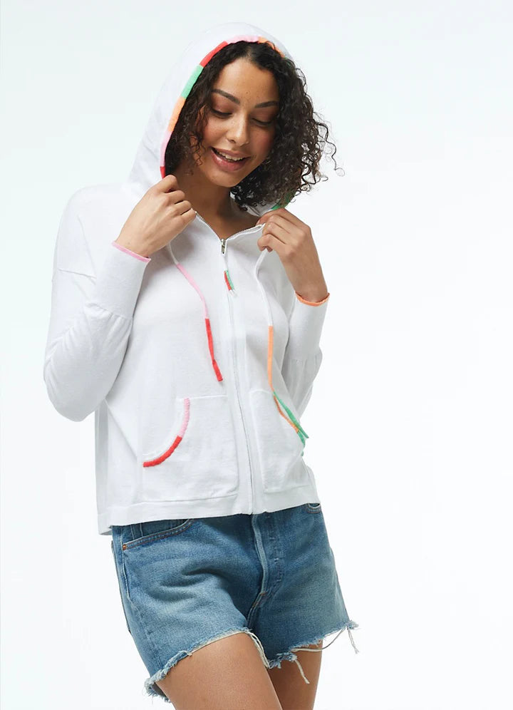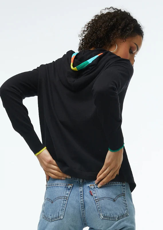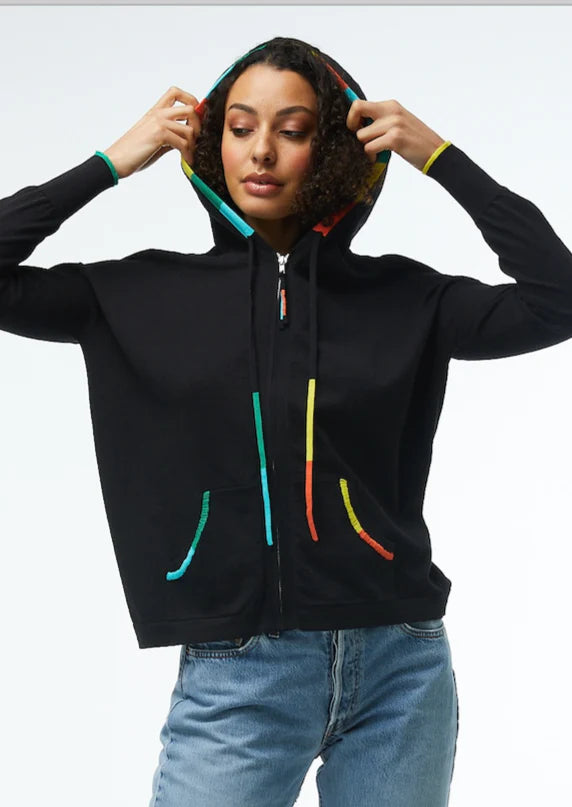 Fantastic sweater knit hoodie with colorful accents trimming the hood, cuffs and pockets, as well as the drawstrings. Perfect for those cool summer breezes. It has long sleeves with slightly gathered cuffs, a zipper front, and pockets.